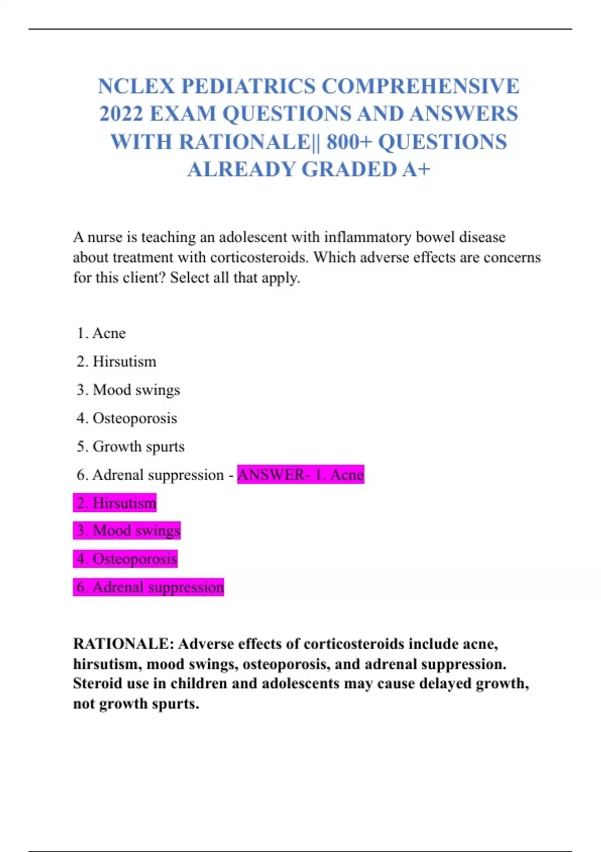 NCLEX PEDIATRICS COMPREHENSIVE 2022 EXAM QUESTIONS AND ANSWERS WITH RATIONALE|| 800+ QUESTIONS ALREADY GRADED A+NCLEX PEDIATRICS COMPREHENSIVE 2022 EXAM QUESTIONS AND ANSWERS WITH RATIONALE|| 800+ QUESTIONS ALREADY GRADED A+