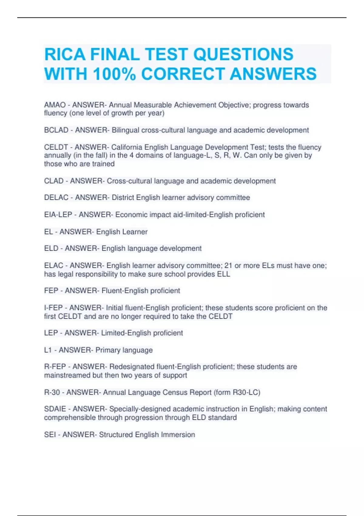 RICA FINAL TEST QUESTIONS WITH 100% CORRECT ANSWERS AMAO - ANSWER- Annual Measurable Achievement Objective; progress towards fluency (one level of growth per year) BCLAD - ANSWER- Bilingual cross-cultural language and academic development CELDT - ANSWER- California English Language Development Test; tests the fluency annually (in the fall) in the 4 domains of language-L, S, R, W. Can only be given by those who are trained CLAD - ANSWER- Cross-cultural language and academic development DELAC - ANSWER- District English learner advisory committee EIA-LEP - ANSWER- Economic impact aid-limited-English proficient EL - ANSWER- English Learner ELD - ANSWER- English language development ELAC - ANSWER- English learner advisory committee; 21 or more ELs must have one; has legal responsibility to make sure school provides ELL FEP - ANSWER- Fluent-English proficient I-FEP - ANSWER- Initial fluent-English proficient; these students score proficient on the first CELDT and are no longer required to take the CELDT LEP - ANSWER- Limited-English proficient L1 - ANSWER- Primary language R-FEP - ANSWER- Redesignated fluent-English proficient; these students are mainstreamed but then two years of support R-30 - ANSWER- Annual Language Census Report (form R30-LC) SDAIE - ANSWER- Specially-designed academic instruction in English; making content comprehensible through progression through ELD standard SEI - ANSWER- Structured English Immersion STS - ANSWER- Standards-Based Test in Spanish open syllable - ANSWER- a syllable that ends in a vowel phoneme (play, blue) syllable - ANSWER- the unit of pronunciation; the English syllable has only one vowel phoneme; there are as many syllables in a word as there are vowel phonemes; there is only one vowel phoneme in a syllable closed syllable - ANSWER- a syllable that ends in a consonant phoneme (/trip/) diacritical mark - ANSWER- a special mark or symbol added to a letter to indicate pronunciation; the breve, a u-shaped symbol placed over a vowel to indicate a short pronunciation, and the macron, a line places over a vowel to indicate a long pronunciation, are two of the most common diacritical marks consonant blend - ANSWER- A combination of two or more adjacent consonant phonemes that are blended together when pronounced, as the /bl/ in /blue/. It is common practice in many teachers' manual and curriculum guides to refer to the consonant letters that represent these phonemes as consonant blends, as the bl in the word blue. Consonant cluster and consonant blend are used interchangeably in this text consonant digraph - ANSWER- a two-letter consonant grapheme that represents a phoneme not represented by the single letters, such as the sh in shoe free morpheme - ANSWER- the smallest unit of meaning that can stand alone; a free morpheme cannot be divided into smaller units and retain its meaning (play) derivational suffix - ANSWER- a unit of meaning added to the end of a word that modifies its meaning and may change its grammatical category; the suffix -able changes a verb (like) to an adjective (likable) schwa - ANSWER- a vowel phoneme in an unaccented syllable that represents a soft "uh" and is indicated by the key symbol ə, which resembles an inverted e. Key words: comm-a, chick-e-n, fam-i-ly, butt-o-n, circ-u-s bound morpheme - ANSWER- a unit of meaning that must be added to another morpheme; a bound morpheme cannot stand on its own; un- and -ing are examples of bound morphemes inflectional suffix - ANSWER- a unit of meaning added to the end of a word that changes its number, affects verb tense, indicates possession, or denotes a comparison (pick, picks, picker, picking) suffix - ANSWER- a bound morpheme placed at the end a word (played) diphthong - ANSWER- a single vowel phoneme resembling a glide from one sound to another; represented by the graphemes oi (noise), oy (toy), ou (found), and ow (now): key symbols are oi and ou, key words are oil and house consonant phoneme - ANSWER- represented by 18 of the consonant letters of the alphabet plus 7 digraphs two like consonants - ANSWER- only one is sounded in a word when they appear together in a word or syllable final consonant - ANSWER- doubled before a suffix (Exceptions: bus is buses); no doubling of the consonant in targeted and benefited; if it ends in silent e, a consonant blend, or consonant digraph, or includes a long vowel phoneme, do not double CVVC pattern - ANSWER- Vowel is long (boat, maid, meet) VC pattern - ANSWER- word ends in one vowel and one consonant, "get" Cloze Assessment - ANSWER- An exercise, test, or assessment consisting of a portion of text with certain words removed , where the participant is asked to replace the missing words Elkonin boxes - ANSWER- a strategy for segmenting sounds in a word that involves drawing a box to represent each sound in a wor
