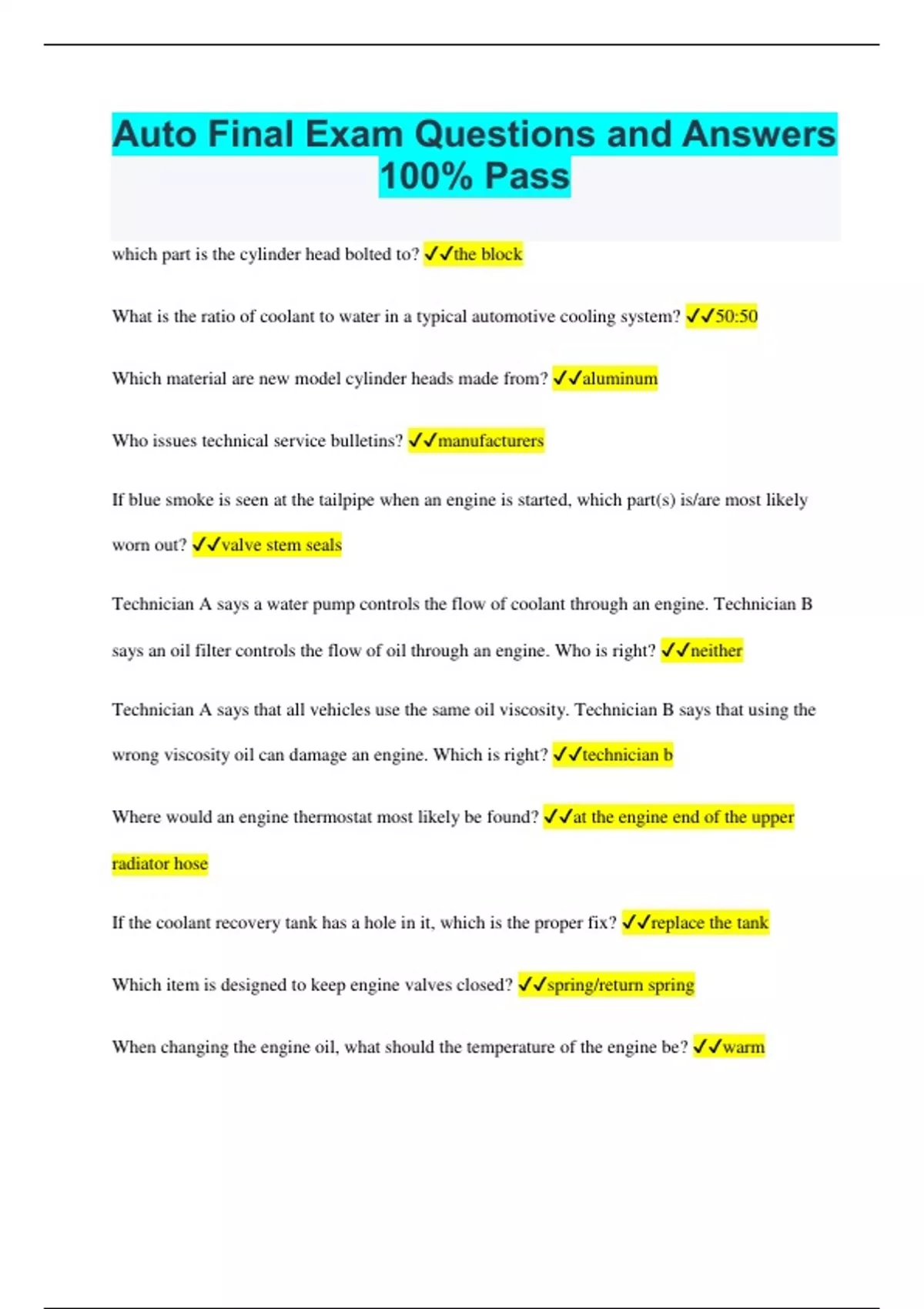 auto final exam questions and answers 100 pass
