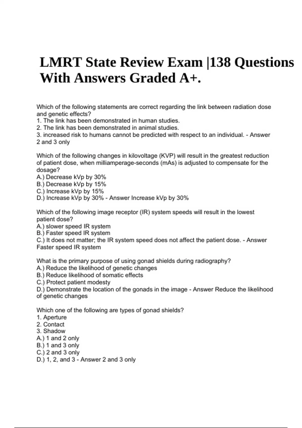 LMRT State Review Exam |138 Questions With Answers Graded A+. Which of the following statements are correct regarding the link between radiation dose and genetic effects? 1. The link has been demonstrated in human studies. 2. The link has been demonstrated in animal studies. 3. increased risk to humans cannot be predicted with respect to an individual. - Answer 2 and 3 only Which of the following changes in kilovoltage (KVP) will result in the greatest reduction of patient dose, when milliamperage-seconds (mAs) is adjusted to compensate for the dosage? A.) Decrease kVp by 30% B.) Decrease kVp by 15% C.) Increase kVp by 15% D.) Increase kVp by 30% - Answer Increase kVp by 30% Which of the following image receptor (IR) system speeds will result in the lowest patient dose? A.) slower speed IR system B.) Faster speed IR system C.) It does not matter; the IR system speed does not affect the patient dose. - Answer Faster speed IR system What is the primary purpose of using gonad shields during radiography? A.) Reduce the likelihood of genetic changes B.) Reduce likelihood of somatic effects C.) Protect patient modesty D.) Demonstrate the location of the gonads in the image - Answer Reduce the likelihood of genetic changes Which one of the following are types of gonad shields? 1. Aperture 2. Contact 3. Shadow A.) 1 and 2 only B.) 1 and 3 only C.) 2 and 3 only D.) 1, 2, and 3 - Answer 2 and 3 only LMRT State Review Exam |138 Questions With Answers Graded A+. When should gonad shielding be used? A.) for all patients B.) For all procedures C.) when the gonads are within 10 cm of the radiation field D.) when the gonads are within 5 cm of the radiation field - Answer when the gonads are within 5 cm of the radiation field The greatest cause of unnecessary radiation to patients that can be controlled by the limited operator is: A.) Patient condition B.) Patient size C.) Repeat exposure D.) equipment malfunction - Answer Repeat exposure The limited operator can reduce repeat exposures by: A.) Accepting marginal images B.) Clearly instructing patients C.) increasing the source-image receptor distance (SID) D.) optimizing the kVp - Answer Clearly instructing patients How does x-ray beam restriction minimize patient exposure? A.) it limits radiation fog B.) It limits the radiation field to the area of interest C.) It limits the effect of patient motion D.) It limits repeat exposure - Answer It limits the radiation field to the area of interest What is the device that allows the limited operator to vary the size of the radiation field? A.) Collimator B.) Detent C.) Filter D.) Sheild - Answer Collimator How does filtration reduce patient exposure? A.) Removes the shorter-wavelength photons B.) Removes longer wavelength photons C.) Reduces the size of the radiation field D.) Reduces the time of exposure - Answer Removes longer wavelength photons What is the National Council on Radiation Protection and Measurements (NCRP) recommendation for the amount of total filtration? A.) 0.5mm aluminum equivalent ( AL Equiv) B.) 1.5mm AL Equiv C.) 2.5mm Al Equiv D.) 3.5mm Al Equiv - Answer 2.5mm Al Equiv What are the three principal methods used to protect limited operators from unnecessary radiation exposure? A. Time, Distance, and Shielding B.) Time, Distance, and Collimation C.) Distance, Collimation, and Shielding D.) Time, Collimation, and Filtration - Answer Time, Distance, and Shielding Which of the following is not a type of personnel radiation shielding? A.) Apron B.) Glove C.) Thyroid Shield D.) Shadow - Answer Shadow Personnel shielding must be worn on the rare occasion during which the limited operator may need to remain in the radiographic room during the exposure to assist the patient in maintaining the proper position . What is the source of the greatest radiation hazard under this circumstance? A.) Off-focus radiation B.) Leakage Radiation C.) Scattered Radiation from the patient D.) Back scatter radiation from the IR - Answer Scattered Radiation from the patient What is the term for radiation that escapes from the x-ray tube housing? A.) Scatter radiation B.) Off-focus radiation C.) Primary Radiation D.) Leakage Radiation - Answer Leakage Radiation Why are limited operators prohibited from activities that results in direct exposure to the primary x-ray beam? A.) They are considered occupationally exposed individuals B.) These activities carry immediate health risk C.) Their interaction with the beam will affect patient dose D.) Their presence near the patient increases liability - Answer They are considered occupationally exposed individuals .