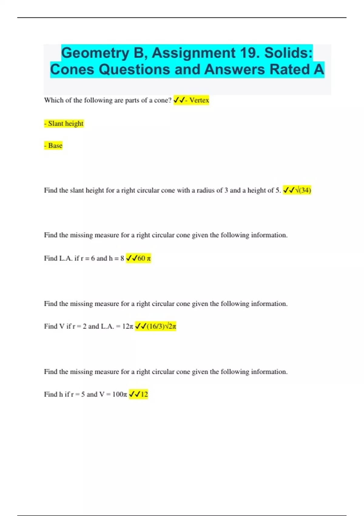 Geometry B, Assignment 19. Solids: Cones Questions and Answers Rated A