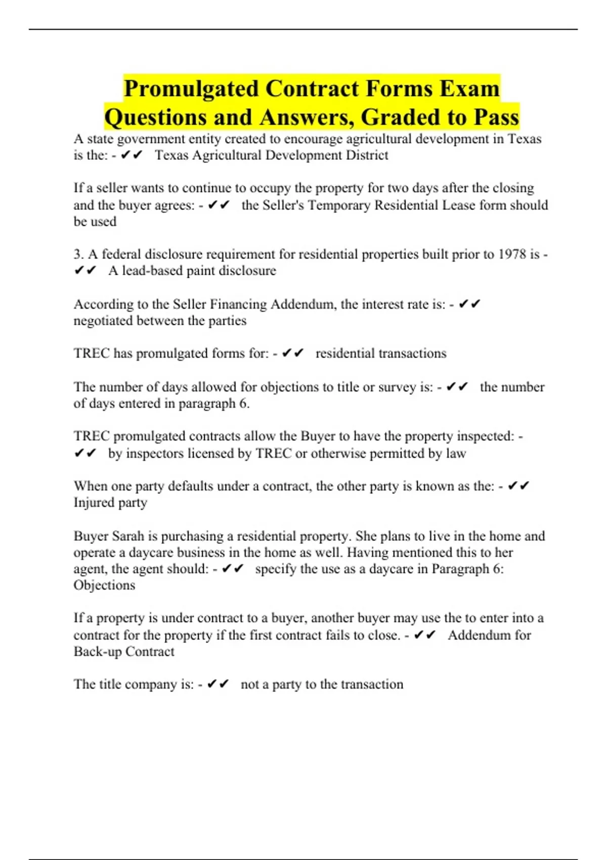 Promulgated Contract Forms Exam Questions and Answers, Graded to Pass