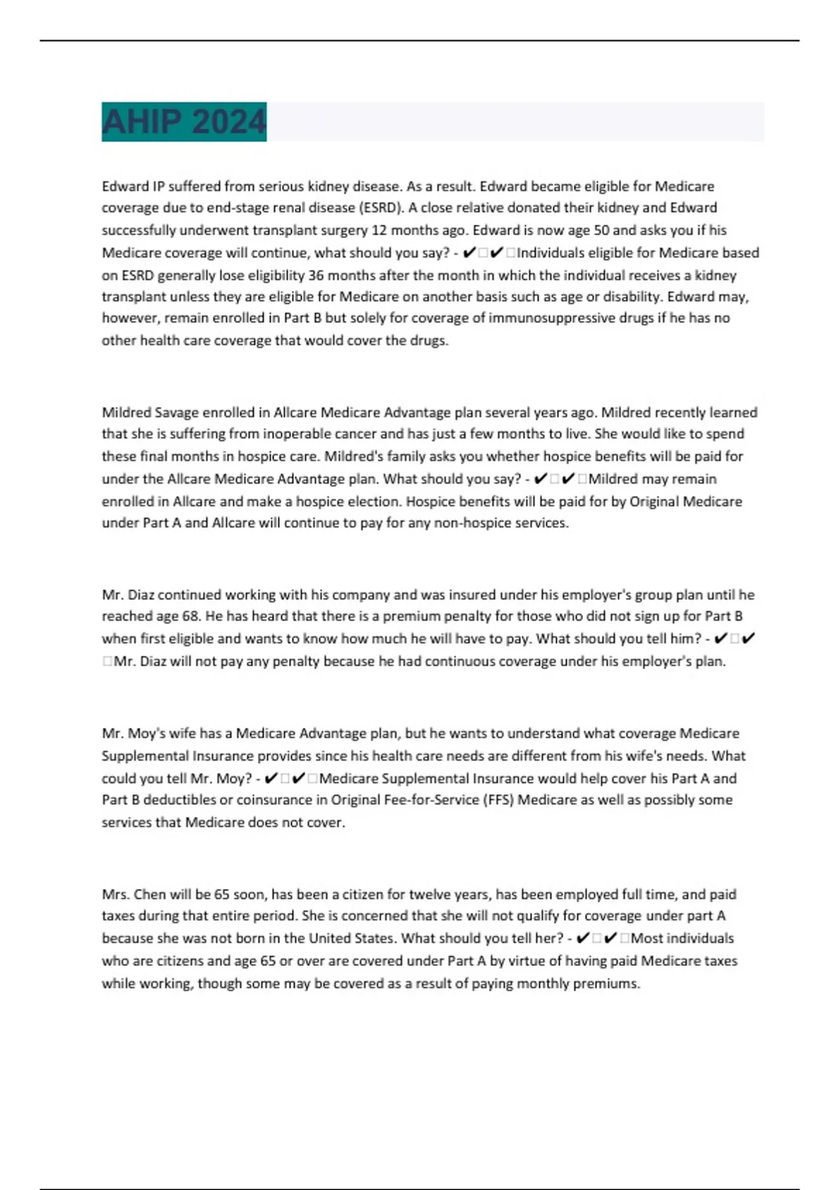 Edward IP suffered from serious kidney disease. As a result. Edward became eligible for Medicare coverage due to end-stage renal disease (ESRD). A close relative donated their kidney and Edward successfully underwent transplant surgery 12 months ago. Edward is now age 50 and asks you if his Medicare coverage will continue, what should you say? - ️️Individuals eligible for Medicare based on ESRD generally lose eligibility 36 months after the month in which the individual receives a kidney transplant unless they are eligible for Medicare on another basis such as age or disability. Edward may, however, remain enrolled in Part B but solely for coverage of immunosuppressive drugs if he has no other health care coverage that would cover the drugs. Mildred Savage enrolled in Allcare Medicare Advantage plan several years ago. Mildred recently learned that she is suffering from inoperable cancer and has just a few months to live. She would like to spend these final months in hospice care. Mildred's family asks you whether hospice benefits will be paid for under the Allcare Medicare Advantage plan. What should you say? - ️️Mildred may remain enrolled in Allcare and make a hospice election. Hospice benefits will be paid for by Original Medicare under Part A and Allcare will continue to pay for any non-hospice services. Mr. Diaz continued working with his company and was insured under his employer's group plan until he reached age 68. He has heard that there is a premium penalty for those who did not sign up for Part B when first eligible and wants to know how much he will have to pay. What should you tell him? - ️️Mr. Diaz will not pay any penalty because he had continuous coverage under his employer's plan. Mr. Moy's wife has a Medicare Advantage plan, but he wants to understand what coverage Medicare Supplemental Insurance provides since his health care needs are different from his wife's needs. What could you tell Mr. Moy? - ️️Medicare Supplemental Insurance would help cover his Part A and Part B deductibles or coinsurance in Original Fee-for-Service (FFS) Medicare as well as possibly some services that Medicare does not cover. Mrs. Chen will be 65 soon, has been a citizen for twelve years, has been employed full time, and paid taxes during that entire period. She is concerned that she will not qualify for coverage under part A because she was not born in the United States. What should you tell her? - ️️Most individuals who are citizens and age 65 or over are covered under Part A by virtue of having paid Medicare taxes while working, though some may be covered as a result of paying monthly premiums.