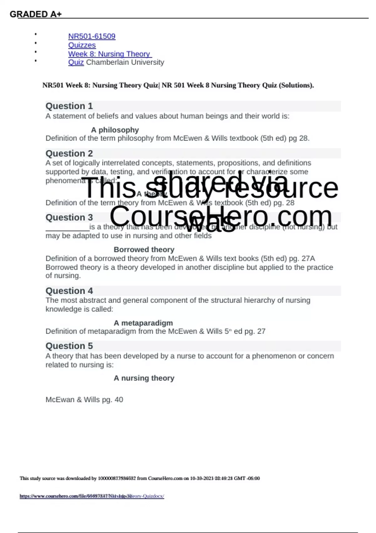 NR501 Week 8: Nursing Theory Quiz| NR 501 Week 8 Nursing Theory Quiz (Solutions). Question 1 A statement of beliefs and values about human beings and their world is: A philosophy Definition of the term philosophy from McEwen & Wills textbook (5th ed) pg 28. Question 2 A set of logically interrelated concepts, statements, propositions, and definitions supported by data, testing, and verification to account for or characterize some phenomena is called: A theory Definition of the term theory from McEwen & Wills textbook (5th ed) pg. 28 Question 3 is a theory that has been developed by another discipline (not nursing) but may be adapted to use in nursing and other fields Borrowed theory Definition of a borrowed theory from McEwen & Wills text books (5th ed) pg. 27A Borrowed theory is a theory developed in another discipline but applied to the practice of nursing. Question 4 The most abstract and general component of the structural hierarchy of nursing knowledge is called: A metaparadigm Definition of metaparadigm from the McEwen & Wills 5 th ed pg. 27 Question 5 A theory that has been developed by a nurse to account for a phenomenon or concern related to nursing is: A nursing theory McEwan & Wills pg. 40 This study resource was shared via CourseH • • • • NR Quizzes Week 8: Nursing Theory Quiz Chamberlain University This study source was downloaded by from CourseH on :10:21 GMT -05:00 This study source was downloaded by from CourseH on :49:28 GMT -06:00 GRADED A+ The nursing paradigm identifies four concepts of interest to the nursing profession. These four concepts are: The person, health, environment/situation, and nursing Description, explanation, prediction, and prescription of an interrelationship of nursing McEwen & Wills (5 th ed) pgs. 41-44 A group of theories that are broad in scope, complex, and provide broad and abstract views about nursing are called: A grand theory McEwen & Wills 5 th ed pg. 37 & chap. 6 A group of theories that are more limited in scope, less abstract, reflect practice, and addresses a specific phenomenon are called: A middle range theory McEwen & Wills (5 th ed) pgs. 37-38 & Chap. 10 A central construct in nursing would be: Caring What do the following theories written by Watson, Swanson, Duffy, Boykin & Schoenhofer, and Hall have in common? They focus on care and caring An example of a nursing theory would be: Benner's Novice to Expert theory True or False: Concepts are words or phrases that refer to or describe a phenomenon. True