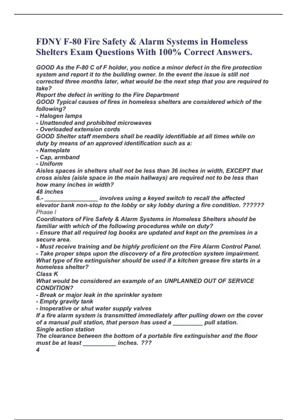 FDNY F-80 Fire Safety & Alarm Systems in Homeless Shelters Exam Questions With 100% Correct Answers.