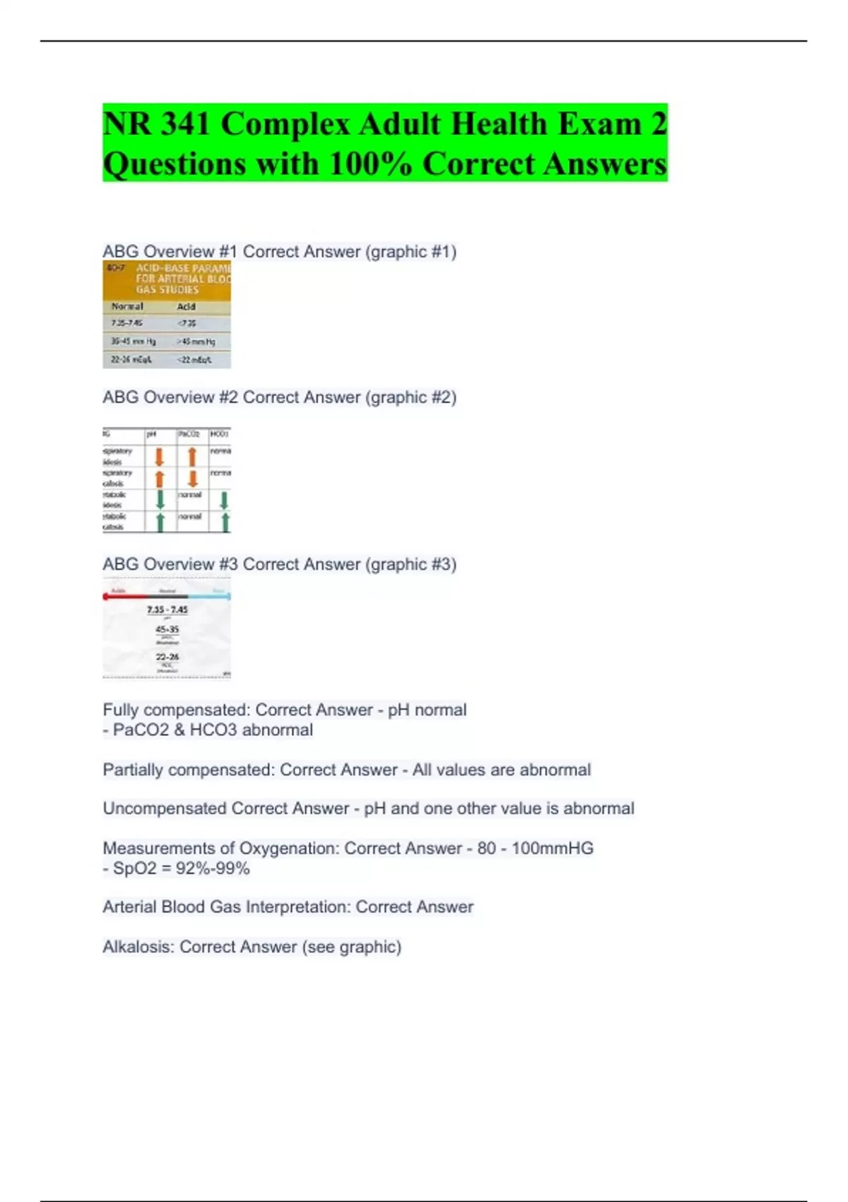 ABG Overview #1 Correct Answer (graphic #1) ABG Overview #2 Correct Answer (graphic #2) ABG Overview #3 Correct Answer (graphic #3) Fully compensated: Correct Answer - pH normal - PaCO2 & HCO3 abnormal Partially compensated: Correct Answer - All values are abnormal Uncompensated Correct Answer - pH and one other value is abnormal Measurements of Oxygenation: Correct Answer - 80 - 100mmHG - SpO2 = 92%-99% Arterial Blood Gas Interpretation: Correct Answer Alkalosis: Correct Answer (see graphic) Acidosis: Correct Answer (see graphic) Potassium Levels in Acidosis: Correct Answer - K+ = Elevated Respiratory Acidosis: Correct Answer - low pH, high CO2 Respiratory Alkalosis: Correct Answer - high pH, low CO2 Metabolic Acidosis: Correct Answer - low pH, low HCO3 Metabolic Alkalosis: Correct Answer - high pH, high HCO3