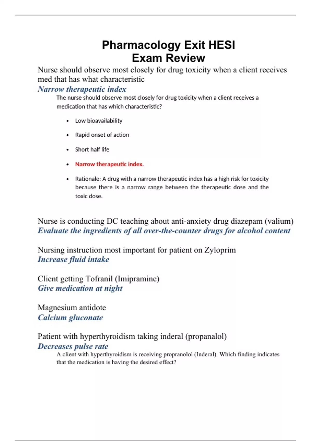 Nurse should observe most closely for drug toxicity when a client receives med that has what characteristic Narrow therapeutic index The nurse should observe most closely for drug toxicity when a client receives a medication that has which characteristic? • Low bioavailability • Rapid onset of action • Short half life • Narrow therapeutic index. • Rationale: A drug with a narrow therapeutic index has a high risk for toxicity because there is a narrow range between the therapeutic dose and the toxic dose. Nurse is conducting DC teaching about anti-anxiety drug diazepam (valium) Evaluate the ingredients of all over-the-counter drugs for alcohol content Nursing instruction most important for patient on Zyloprim Increase fluid intake Client getting Tofranil (Imipramine) Give medication at night Magnesium antidote Calcium gluconate Patient with hyperthyroidism taking inderal (propanalol) Decreases pulse rate A client with hyperthyroidism is receiving propranolol (Inderal). Which finding indicates that the medication is having the desired effect? • Decrease in serum T4 levels • Increase in blood pressure • Decrease in pulse rate • Goiter no longer palpable Medication dosing-heparin 25000 units at 7ml/hr doctor changed rate to 900 units what is the Mls/hr Med was ordered 100mg in 4 divided doses in 24 hours available in 25mg, how many will you give every 6 hours 1 Patient on benzos Answer is not narcan - A client experiencing withdrawal from the benzodiazepines alprazolam (Xanax) is demonstrating severe agitation and tremors. What is the best initial nursing action? • Administer naloxone (Narcan) per PNR protocol • Initiate seizure precautions • Obtain a serum drug screen • Instruct the family about withdrawal symptoms. • Rationale: Withdrawal of CNS depressants, such as Xanax, results in rebound over-excitation of the CNS. Since the client exhibiting tremors, the nurse should anticipate seizure activity and protect the client.