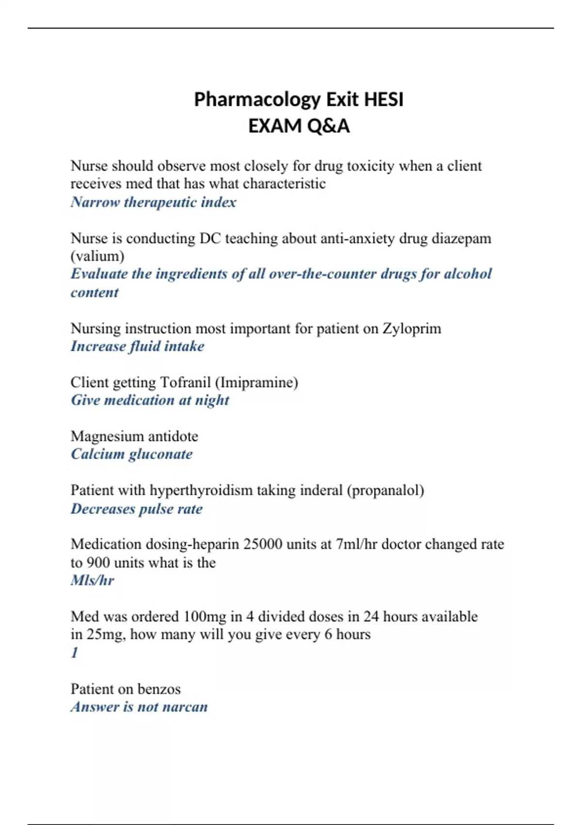 Nurse should observe most closely for drug toxicity when a client receives med that has what characteristic Narrow therapeutic index Nurse is conducting DC teaching about anti-anxiety drug diazepam (valium) Evaluate the ingredients of all over-the-counter drugs for alcohol content Nursing instruction most important for patient on Zyloprim Increase fluid intake Client getting Tofranil (Imipramine) Give medication at night