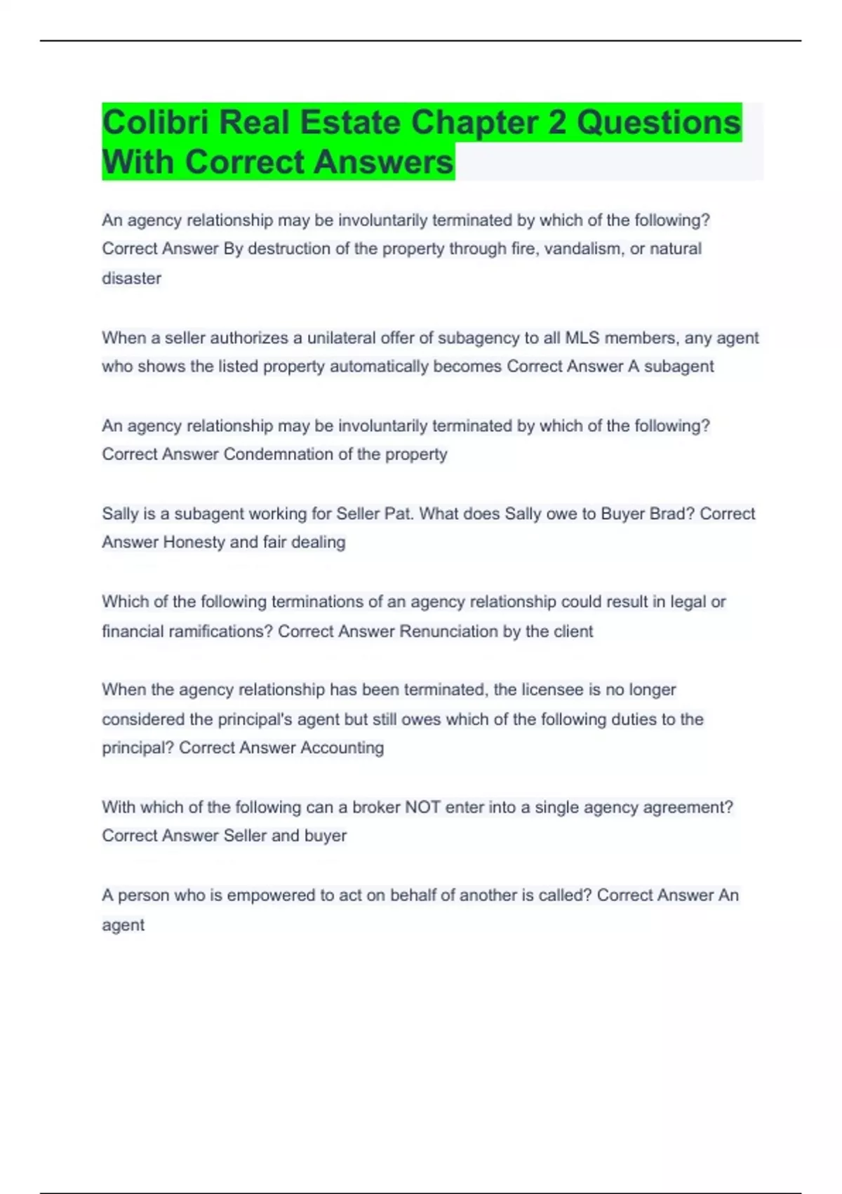 Colibri Real Estate Chapter 2 Questions With Correct Answers An agency relationship may be involuntarily terminated by which of the following? Correct Answer By destruction of the property through fire, vandalism, or natural disaster When a seller authorizes a unilateral offer of subagency to all MLS members, any agent who shows the listed property automatically becomes Correct Answer A subagent An agency relationship may be involuntarily terminated by which of the following? Correct Answer Condemnation of the property Sally is a subagent working for Seller Pat. What does Sally owe to Buyer Brad? Correct Answer Honesty and fair dealing Which of the following terminations of an agency relationship could result in legal or financial ramifications? Correct Answer Renunciation by the client When the agency relationship has been terminated, the licensee is no longer considered the principal's agent but still owes which of the following duties to the principal? Correct Answer Accounting With which of the following can a broker NOT enter into a single agency agreement? Correct Answer Seller and buyer A person who is empowered to act on behalf of another is called? Correct Answer An agent When the agency relationship has been terminated, the licensee is no longer considered the principal's agent but still owes which of the following duties to the principal? Correct Answer Confidentiality When a seller gives permission to a broker to submit the property to the MLS, the seller is authorizing the broker to make a blanket unilateral offer of what to all the other members of that MLS? Correct Answer Subagency What is the term given to an agent who is acting as a buyer's and seller's agent in the same transaction? Correct Answer Dual agent