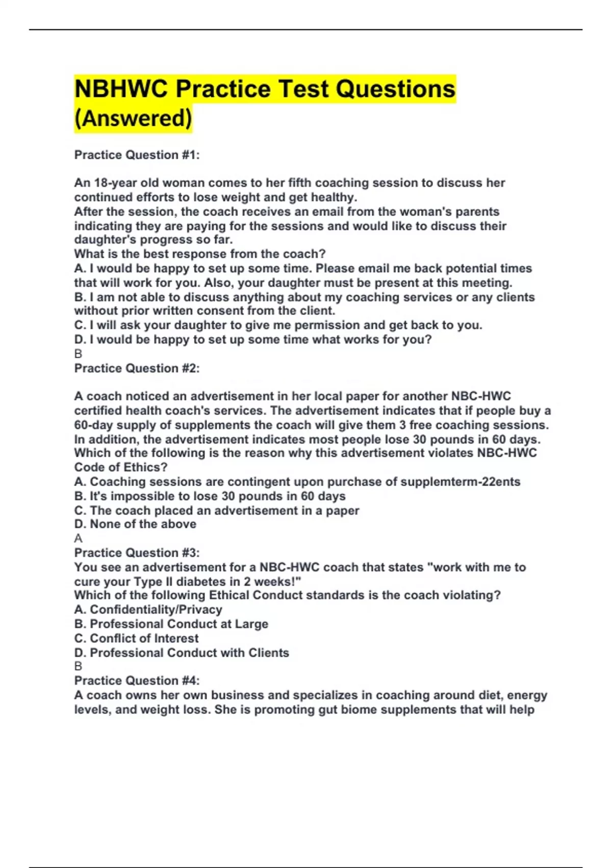 NBHWC Practice Test Questions (Answered) Practice Question #1: An 18-year old woman comes to her fifth coaching session to discuss her continued efforts to lose weight and get healthy. After the session, the coach receives an email from the woman's parents indicating they are paying for the sessions and would like to discuss their daughter's progress so far. What is the best response from the coach? A. I would be happy to set up some time. Please email me back potential times that will work for you. Also, your daughter must be present at this meeting. B. I am not able to discuss anything about my coaching services or any clients without prior written consent from the client. C. I will ask your daughter to give me permission and get back to you. D. I would be happy to set up some time what works for you? B Practice Question #2: A coach noticed an advertisement in her local paper for another NBC-HWC certified health coach's services. The advertisement indicates that if people buy a 60-day supply of supplements the coach will give them 3 free coaching sessions. In addition, the advertisement indicates most people lose 30 pounds in 60 days. Which of the following is the reason why this advertisement violates NBC-HWC Code of Ethics? A. Coaching sessions are contingent upon purchase of supplemterm-22ents B. It's impossible to lose 30 pounds in 60 days C. The coach placed an advertisement in a paper D. None of the above A Practice Question #3: You see an advertisement for a NBC-HWC coach that states "work with me to cure your Type II diabetes in 2 weeks!" Which of the following Ethical Conduct standards is the coach violating? A. Confidentiality/Privacy B. Professional Conduct at Large C. Conflict of Interest D. Professional Conduct with Clients B Practice Question #4: A coach owns her own business and specializes in coaching around diet, energy levels, and weight loss. She is promoting gut biome supplements that will help her clients lose 20 pounds in four weeks if they take the supplement daily. The coach is most likely violating which of the following guidelines: A. NBC-HWC Code of Ethics B. HIPAA Laws C. USDA Nutritional Guidelines D. Confidentiality/Privacy A Practice Question #5: Jamal is a wellness coach and also sells supplemental shakes to his coaching clients in which he makes a commission. At what point in the coaching relationship must Jamal disclose this information to his client per the NBC-HWC ethical guidelines? A. At some point during the coaching relationship. B. Before the sale is made to the client. C. At minimum, after the sale to the client. D. Before any coaching begins. D Practice Question #6: Which of the following best explains nonmaleficence as it relates to ethics in coaching? A. Respect for human freedom and dignity B. Pros must outweigh the cons C. Do no harm D. Fairness C Practice Question #7: A client has just completed their well-being assessment prior to their first coaching session. The client's biometric information included the following: Male Age: 45 Nurse Blood Pressure: 110/70 mmHG Total Cholesterol: 185 ml/dL BMI: 24 Fruits/Vegetables: 9 servings per day Physical activity: Runs 2x week for 30 minutes Which of the following would be the most concerning to the coach in the context of recommended health guidelines? A. Blood pressure B. Total cholesterol C. Fruits/Vegetable intake D. Physical activity level D Practice Question #8: As part of the coaching agreement, a coach offers an additional 3 coaching sessions for free if the client purchases a massage package from them as well. The following scenario is: A. Acceptable because the additional coaching sessions are free B. Unacceptable because the offer is a conflict of interest per the NBHWC Code of Ethics C. Acceptable given the 3 free sessions were included as part of the coaching agreement. D. Unacceptable as it is a violation of the professional code of conduct at large per the NBHWC Code of Ethics. B Practice Question #9: A client comes to her fourth coaching session to continue working on her intent to quit smoking someday. She starts out the call by simply saying "I don't know if quitting is really worth it." Prochaska & Prochaska would define this as a statement of doubt which often leads to delay in making any change. The client is most likely in what stage of change? A. Precontemplation B. Contemplation C. Preparation D. None of the above B Practice Question #10: A coach is a member of the exclusive group on Facebook for NBC-HWC coaches. Only those certified by the NBHWC are permitted in this group. To help a friend who has developed a new software, the coach downloads the names of each person in the group and provides them to their friend so that they can implement a marketing campaign to sell this new software to coaches. The above scenario is a violation of which part of the NBC-HWC code of ethics?: A. Professional Conduct at Large B. Conflict of Interest C. Professional Conduct with Clients D. Confidentiality/Privacy A Practice Question #11: A client has submitted their wellness assessment to their coach. There biometric numbers include the following: Blood Pressure: 110/78 mmHg BMI: 23 Total Cholesterol: 155 mg/dl HDL: 30 Which of the following might the coach note as a general concern? A. Blood pressure B. BMI C. Total cholesterol D. HDL D Practice Question #12: You are approached by a researcher, who has IRB approval, to share your health coaching data. You provide the data with no identifying information. Under HIPAA privacy rules, did you need to let your clients know you shared their data? (Muth, pg.167) A. Yes B. No B Practice Question #13: A client has requested that what she is about to talk to you about not be put in her record, your electronic coaching notes, or even written down. Which response is most appropriate? A. "Your confidentiality is important to me and I will not put anything in your record, in my electronic notes, or write anything down." B. "I am required by HIPAA to k