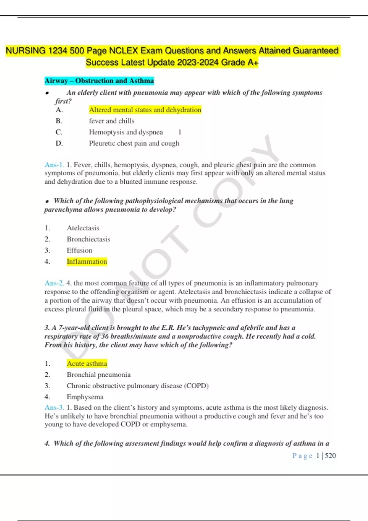 NURSING 1234 500 Page NCLEX Exam Questions and Answers Attained Guaranteed Success Latest Update Grade A+