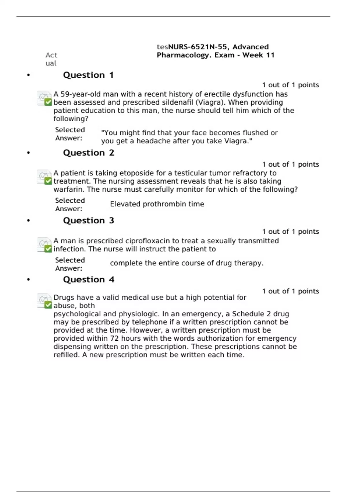 NURS-6521N-55, Advanced Pharmacology. Exam - Week 11 A 59-year-old man with a recent history of erectile dysfunction has been assessed and prescribed sildenafil (Viagra). When providing patient education to this man, the nurse should tell him which of the following? Selected Answer: "You might find that your face becomes flushed or you get a headache after you take Viagra." • Question 2 1 out of 1 points A patient is taking etoposide for a testicular tumor refractory to treatment. The nursing assessment reveals that he is also taking warfarin. The nurse must carefully monitor for which of the following? Selected Answer: Elevated prothrombin time • Question 3 1 out of 1 points A man is prescribed ciprofloxacin to treat a sexually transmitted infection. The nurse will instruct the patient to Selected Answer: complete the entire course of drug therapy. • Question 4 Drugs have a valid medical use but a high potential for abuse, both 1 out of 1 points psychological and physiologic. In an emergency, a Schedule 2 drug may be prescribed by telephone if a written prescription cannot be provided at the time. However, a written prescription must be provided within 72 hours with the words authorization for emergency dispensing written on the prescription. These prescriptions cannot be refilled. A new prescription must be written each time. Examples include certain amphetamines and barbiturates. This is scheduled drug Selected Answer: Schedule 2 • Question 5 1 out of 1 points A 16-year-old boy is prescribed cromolyn sodium nasal spray to treat a nasal allergy. To maximize the therapeutic effects of the drug, which of the following will the nurse include in instructions to the patient? Selected Answer: Take the drug for one full week before coming in contact with allergens • Question 6 1 out of 1 points A woman is receiving magnesium sulfate for intrapartum eclampsia. The patient is perspiring and her blood pressure is 88/50. The serum magnesium level is 10 mg/dL. The nurse will interpret these manifestations as Selected Answer: magnesium sulfate toxicity. • Question 7 1 out of 1 points A patient with a recent diagnosis of chronic myelogenous leukemia (CML) is discussing treatment options with his care team. What aspect of the patient's condition would contraindicate the use of cyclophosphamide for the treatment of leukemia? Selected Answer: The patient's bone marrow function is significantly depressed. • Question 8 1 out of 1 points After 6 months of unsuccessfully trying to conceive, a 31-year-old woman and her husband have sought a referral to a fertility specialist in order to explore their options. A nurse at the clinic should recognize that the woman may benefit from Selected Answer: clomiphene. • Question 9 1 out of 1 points A 34-year-old male has been diagnosed with TB and will be started on INH therapy. The medication history reveals that he currently takes antacids on a regular basis. The nurse will instruct the patient to take Selected Answer: antacids not less than 1 hour before or 2 hours after taking INH. • Question 10 0 out of 1 points A Nurse Practitioner working in a cancer center is preparing to administer medication to a 5-year-old child. The nurse will calculate the drug dosage by using Selected Answer: weigh t.