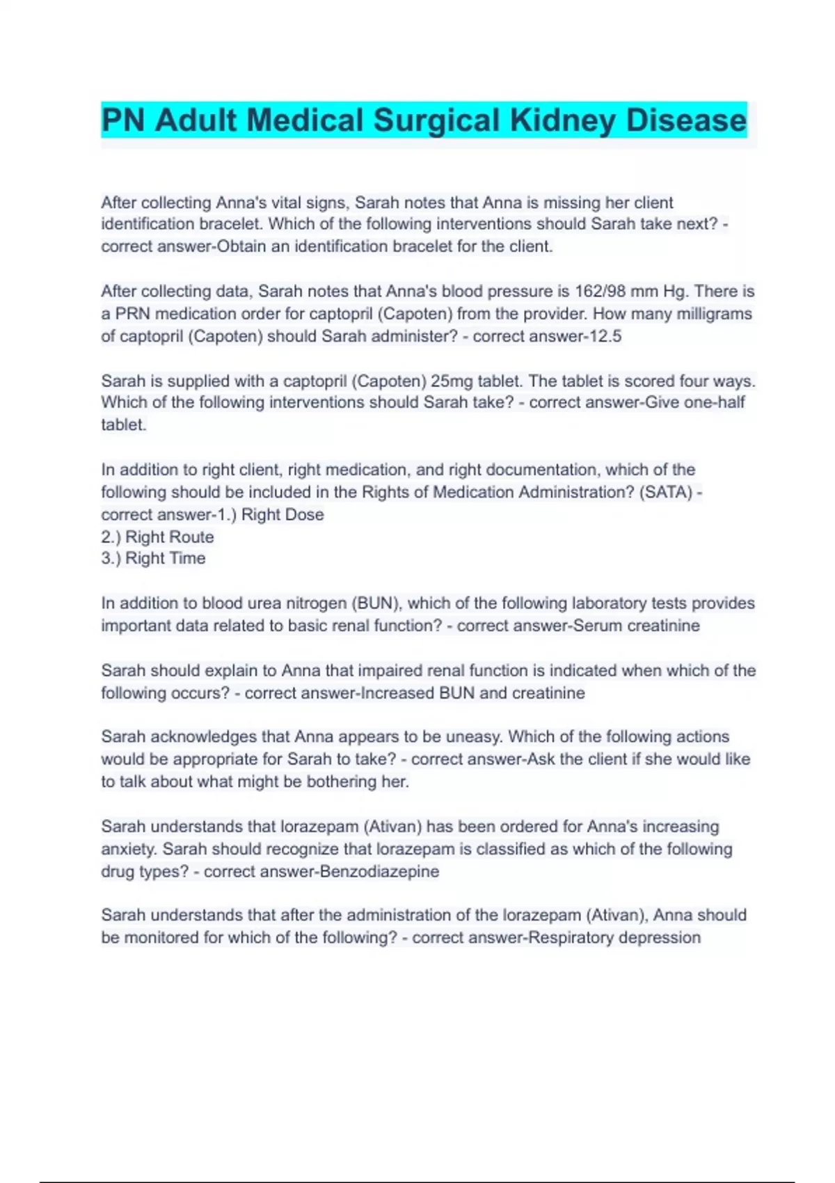 PN Adult Medical Surgical Kidney Disease (100% correct solutions)2023/2024 After collecting Anna's vital signs, Sarah notes that Anna is missing her client identification bracelet. Which of the following interventions should Sarah take next? - correct answer-Obtain an identification bracelet for the client. After collecting data, Sarah notes that Anna's blood pressure is 162/98 mm Hg. There is a PRN medication order for captopril (Capoten) from the provider. How many milligrams of captopril (Capoten) should Sarah administer? - correct answer-12.5