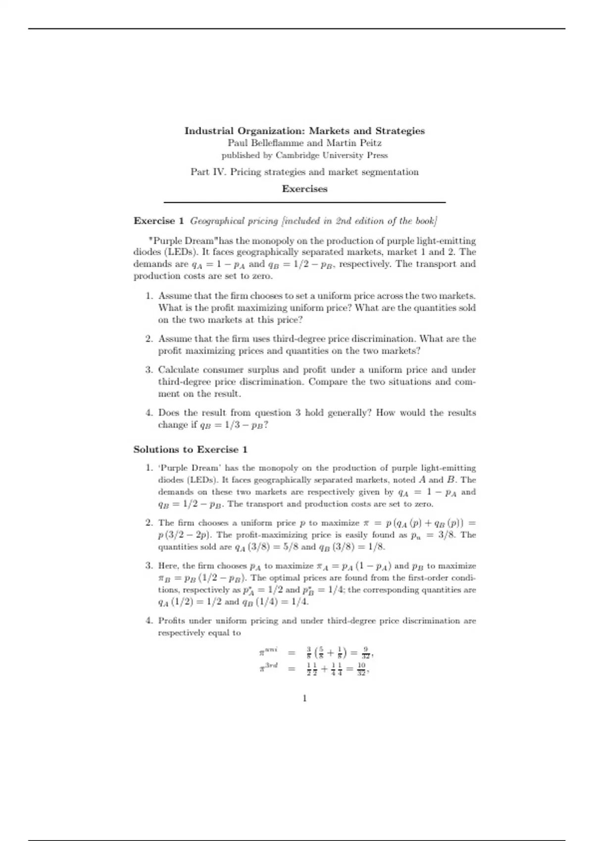 Industrial Organization: Markets and Strategies Paul Belleáamme and Martin Peitz published by Cambridge University Press Part IV. Pricing strategies and market segmentation Exercises Exercise 1 Geographical pricing [included in 2nd edition of the book] "Purple Dream"has the monopoly on the production of purple light-emitting diodes (LEDs). It faces geographically separated markets, market 1 and 2. The demands are qA = 1 pA and qB = 1=2 pB, respectively. The transport and production costs are set to zero. 1. Assume that the Örm chooses to set a uniform price across the two markets. What is the proÖt maximizing uniform price? What are the quantities sold on the two markets at this price? 2. Assume that the Örm uses third-degree price discrimination. What are the proÖt maximizing prices and quantities on the two markets? 3. Calculate consumer surplus and proÖt under a uniform price and under third-degree price discrimination. Compare the two situations and comment on the result. 4. Does the result from question 3 hold generally? How would the results change if qB = 1=3 pB? Solutions to Exercise 1 1. ëPurple Dreamí has the monopoly on the production of purple light-emitting diodes (LEDs). It faces geographically separated markets, noted A and B. The demands on these two markets are respectively given by qA = 1 pA and qB = 1=2 pB. The transport and production costs are set to zero. 2. The Örm chooses a uniform price p to maximize = p (qA (p) + qB (p)) = p (3=2 2p). The proÖt-maximizing price is easily found as pu = 3=8. The quantities sold are qA (3=8) = 5=8 and qB (3=8) = 1=8. 3. Here, the Örm chooses pA to maximize A = pA (1 pA) and pB to maximize B = pB (1=2 pB). The optimal prices are found from the Örst-order conditions, respectively as p A = 1=2 and p B = 1=4; the corresponding quantities are qA (1=2) = 1=2 and qB (1=4) = 1=4. 4. ProÖts under uniform pricing and under third-degree price discrimination are respectively equal to uni = 3 8 5 8 + 1 8 = 9 32 ; 3rd = 1 2 1 2 + 1 4 1 4 =