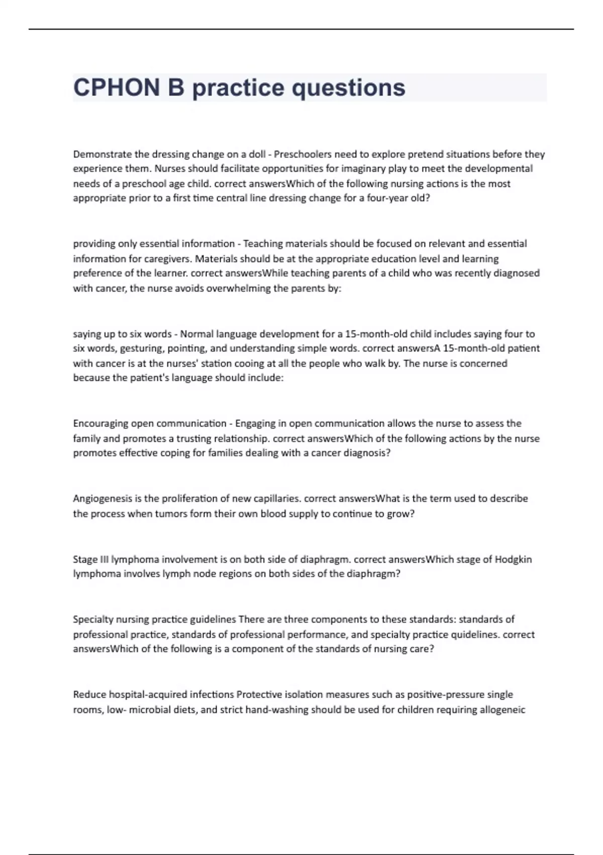 Demonstrate the dressing change on a doll - Preschoolers need to explore pretend situations before they experience them. Nurses should facilitate opportunities for imaginary play to meet the developmental needs of a preschool age child. correct answersWhich of the following nursing actions is the most appropriate prior to a first time central line dressing change for a four-year old? providing only essential information - Teaching materials should be focused on relevant and essential information for caregivers. Materials should be at the appropriate education level and learning preference of the learner. correct answersWhile teaching parents of a child who was recently diagnosed with cancer, the nurse avoids overwhelming the parents by: saying up to six words - Normal language development for a 15-month-old child includes saying four to six words, gesturing, pointing, and understanding simple words. correct answersA 15-month-old patient with cancer is at the nurses' station cooing at all the people who walk by. The nurse is concerned because the patient's language should include: Encouraging open communication - Engaging in open communication allows the nurse to assess the family and promotes a trusting relationship. correct answersWhich of the following actions by the nurse promotes effective coping for families dealing with a cancer diagnosis? Angiogenesis is the proliferation of new capillaries. correct answersWhat is the term used to describe the process when tumors form their own blood supply to continue to grow? Stage III lymphoma involvement is on both side of diaphragm. correct answersWhich stage of Hodgkin lymphoma involves lymph node regions on both sides of the diaphragm? Specialty nursing practice guidelines There are three components to these standards: standards of professional practice, standards of professional performance, and specialty practice quidelines. correct answersWhich of the following is a component of the standards of nursing care? Reduce hospital-acquired infections Protective isolation measures such as positive-pressure single rooms, low- microbial diets, and strict hand-washing should be used for children requiring allogeneic