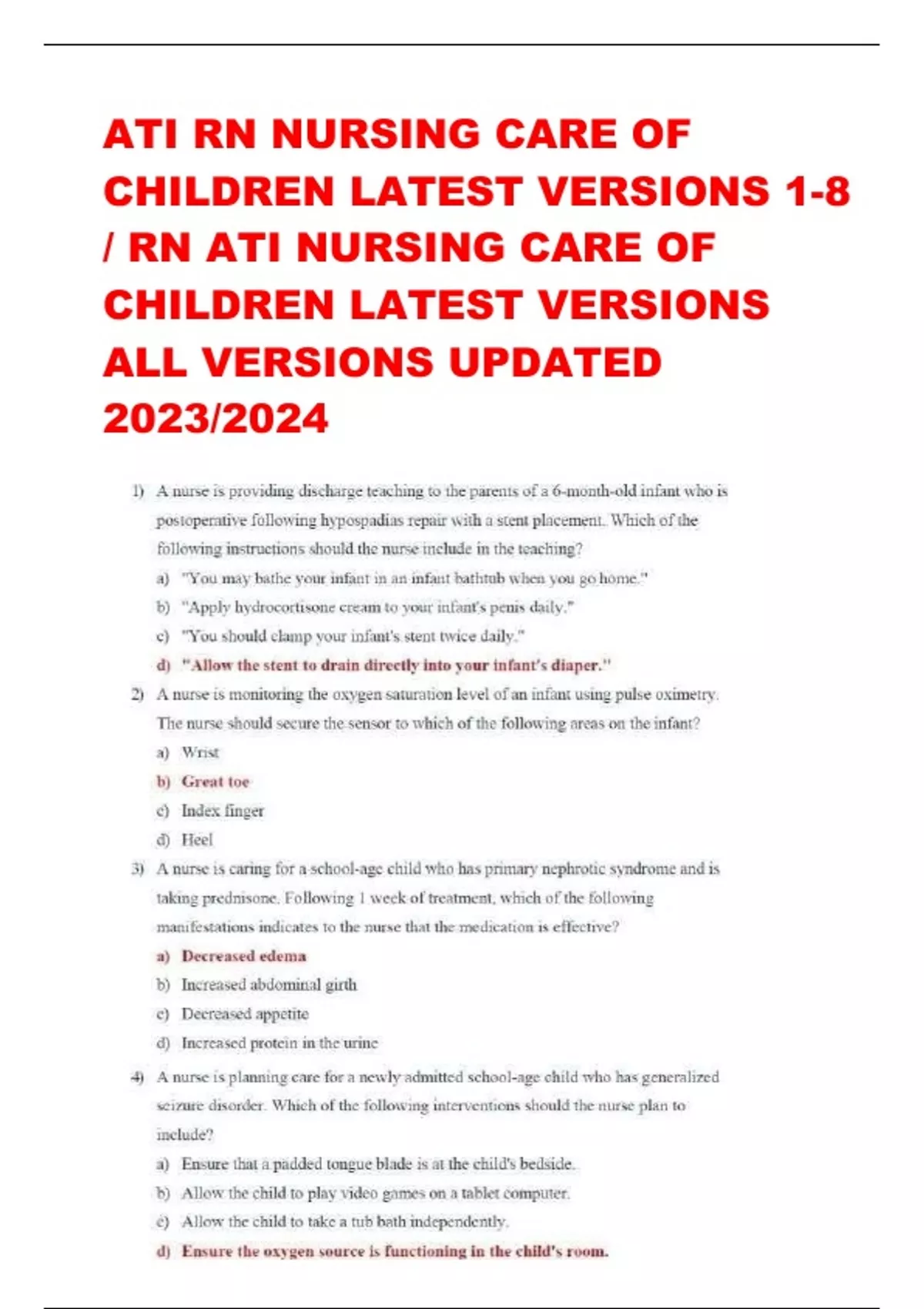 ATI RN NURSING CARE OF CHILDREN LATEST VERSIONS 1-8 / RN ATI NURSING CARE OF CHILDREN LATEST VERSIONS ALL VERSIONS UPDATED 2023/2024