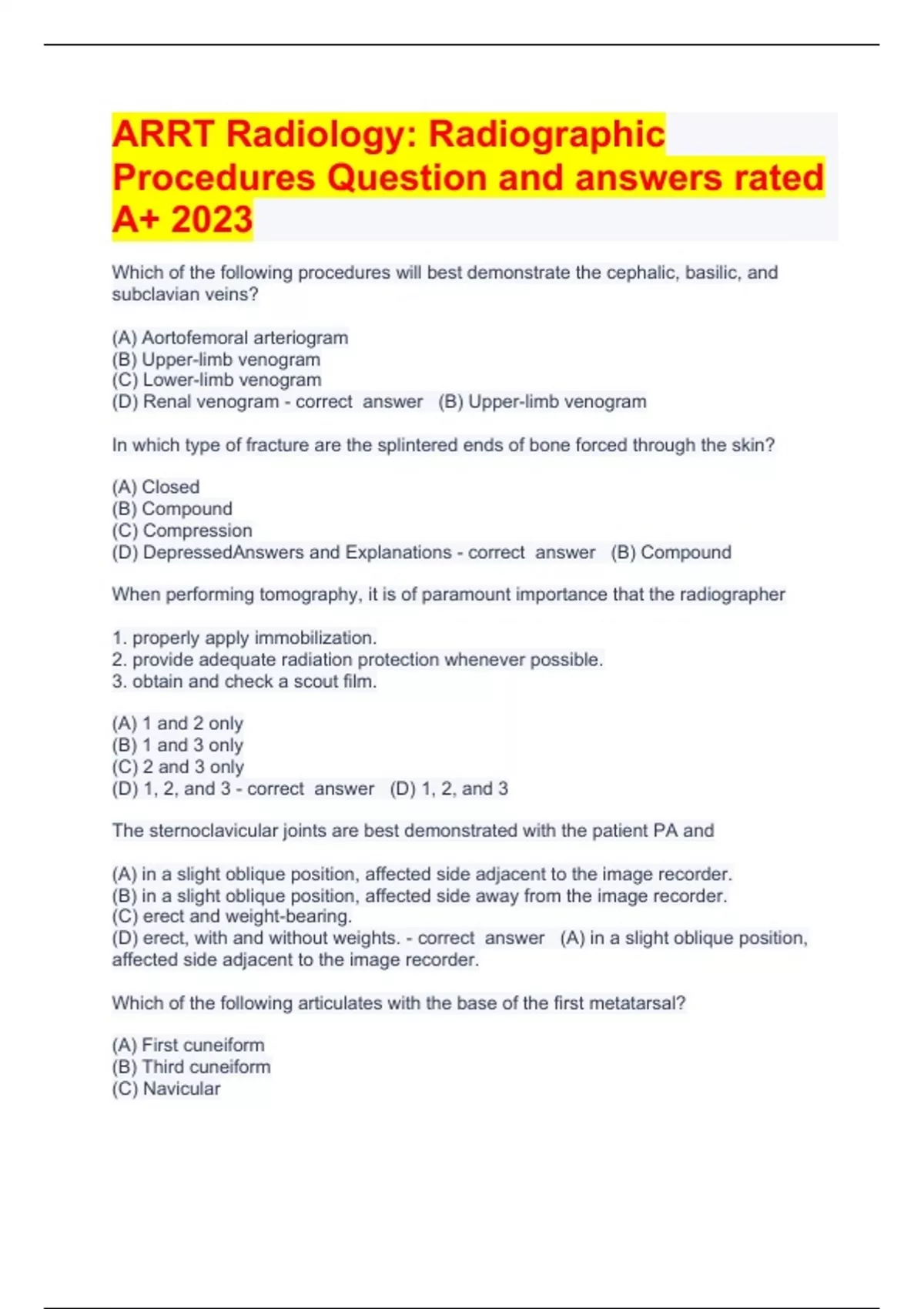 ARRT Radiology Question and answers 2023/2024 verified to passWhich of the following procedures will best demonstrate the cephalic, basilic, and subclavian veins? (A) Aortofemoral arteriogram (B) Upper-limb venogram (C) Lower-limb venogram (D) Renal venogram - correct answer (B) Upper-limb venogram In which type of fracture are the splintered ends of bone forced through the skin? (A) Closed (B) Compound (C) Compression (D) DepressedAnswers and Explanations - correct answer (B) Compound When performing tomography, it is of paramount importance that the radiographer 1. properly apply immobilization. 2. provide adequate radiation protection whenever possible. 3. obtain and check a scout film. (A) 1 and 2 only (B) 1 and 3 o