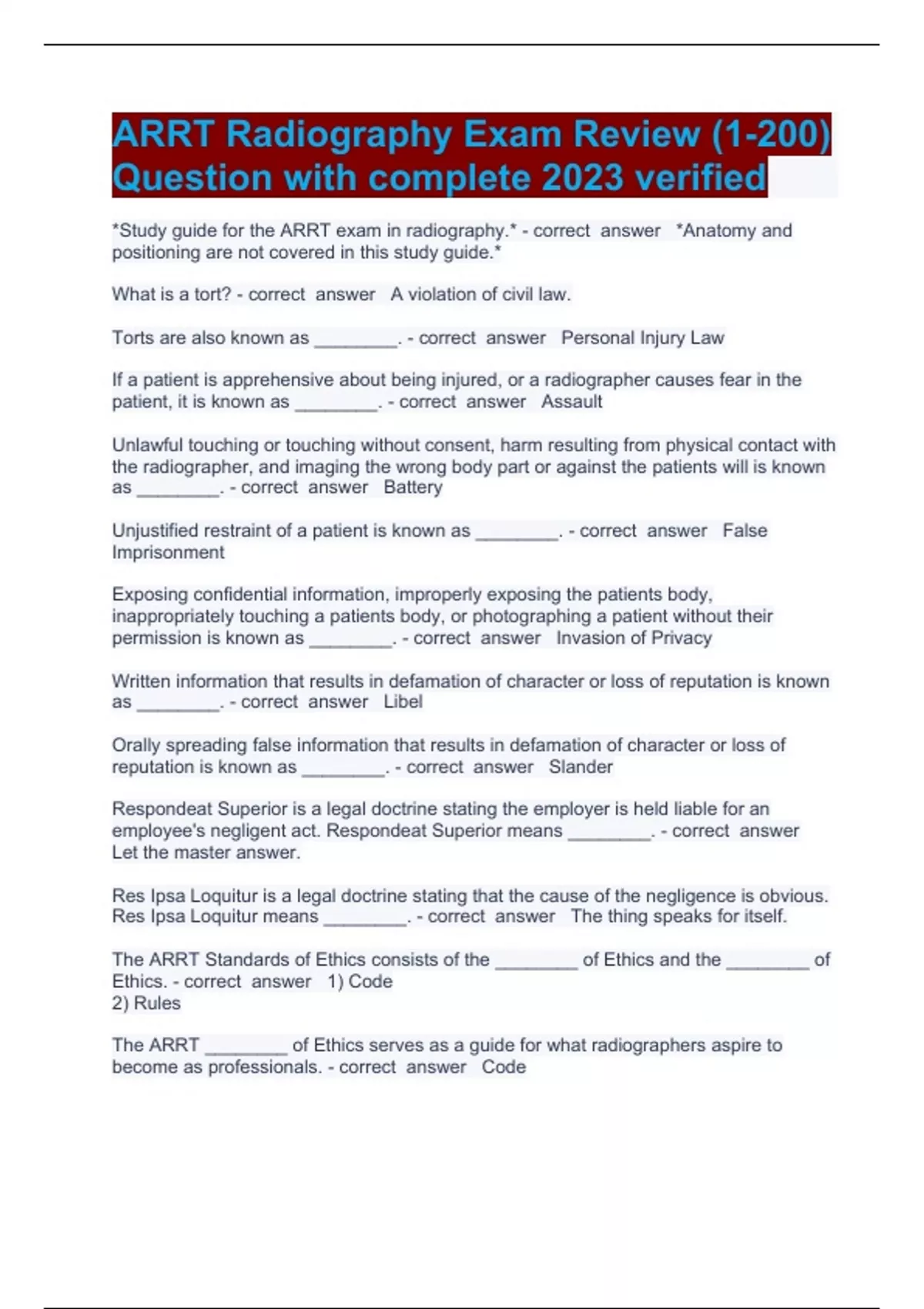 ARRT Radiography Exam Review Question and answers correctly solved 2023/2024*Study guide for the ARRT exam in radiography.* - correct answer *Anatomy and positioning are not covered in this study guide.* What is a tort? - correct answer A violation of civil law. Torts are also known as ________. - correct answer Personal Injury Law If a patient is apprehensive about being injured, or a radiographer causes fear in the patient, it is known as ________. - correct answer Assault Unlawful touching or touching without consent, harm resulting from physical contact with the radiographer, and imaging the wrong body part or against the patients will is known as ________. - correct answer Battery Unjustified restraint of a patient is known as ________. - correct answer False Imprisonment