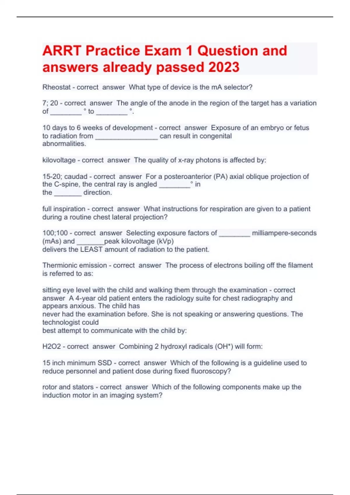 ARRT Practice Exam 1 Question and answers already passed 2023/2024Rheostat - correct answer What type of device is the mA selector? 7; 20 - correct answer The angle of the anode in the region of the target has a variation of ________ ° to ________ °. 10 days to 6 weeks of development - correct answer Exposure of an embryo or fetus to radiation from ________________ can result in congenital abnormalities. kilovoltage - correct answer The quality of x-ray photons is affected by: 15-20; caudad - correct answer For a posteroanterior (PA) axial oblique projection of the C-spine, the central ray is angled ________° in the _______ direction. full inspiration - correct answer What instructions for respiration are given to a patient during a routine chest lateral projection? 100;100 - correct answer Selecting exposure factors of ________ milliampere-seconds (mAs) and _______peak kilov