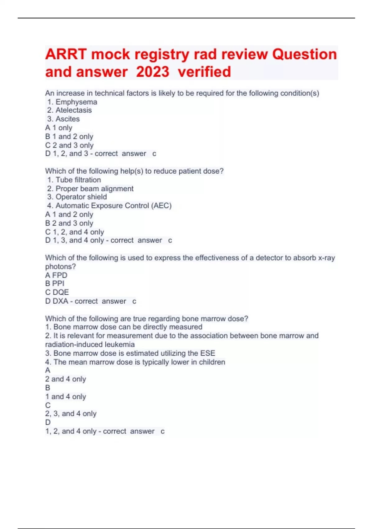 ARRT mock registry rad review Question and answer 2023/2024 verified to passAn increase in technical factors is likely to be required for the following condition(s) 1. Emphysema 2. Atelectasis 3. Ascites A 1 only B 1 and 2 only C 2 and 3 only D 1, 2, and 3 - correct answer c Which of the following help(s) to reduce patient dose? 1. Tube filtration 2. Proper beam alignment 3. Operator shield 4. Automatic Exposure Control (AEC) A 1 and 2 only B 2 and 3 only C 1, 2, and 4 only D 1, 3, and 4 only - correct answer c Which of the following is used to express the effectiveness of a detector to absorb x-ray photons? A FPD B PPI C DQE D DXA - correct answer c Which of the following are true regarding bone marrow dose? 1. Bone marrow dose can be directly measured 2. It is relevant for measurement due to the association between bone marrow and radiation-induced leukemia 3. Bone marrow dose is estimated utilizing the ESE 4. The mean marrow dose is typically lower in children A 2 and 4 only B 1 and 4 only C 2, 3, and 4 only D 1, 2, and 4 only - correct answer c