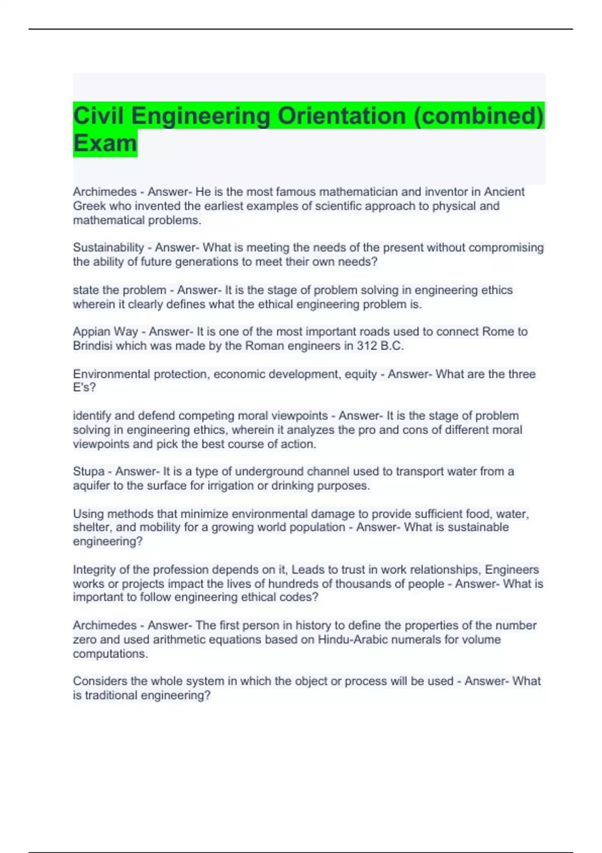 Civil Engineering Orientation (combined) Exam Questions and Answers