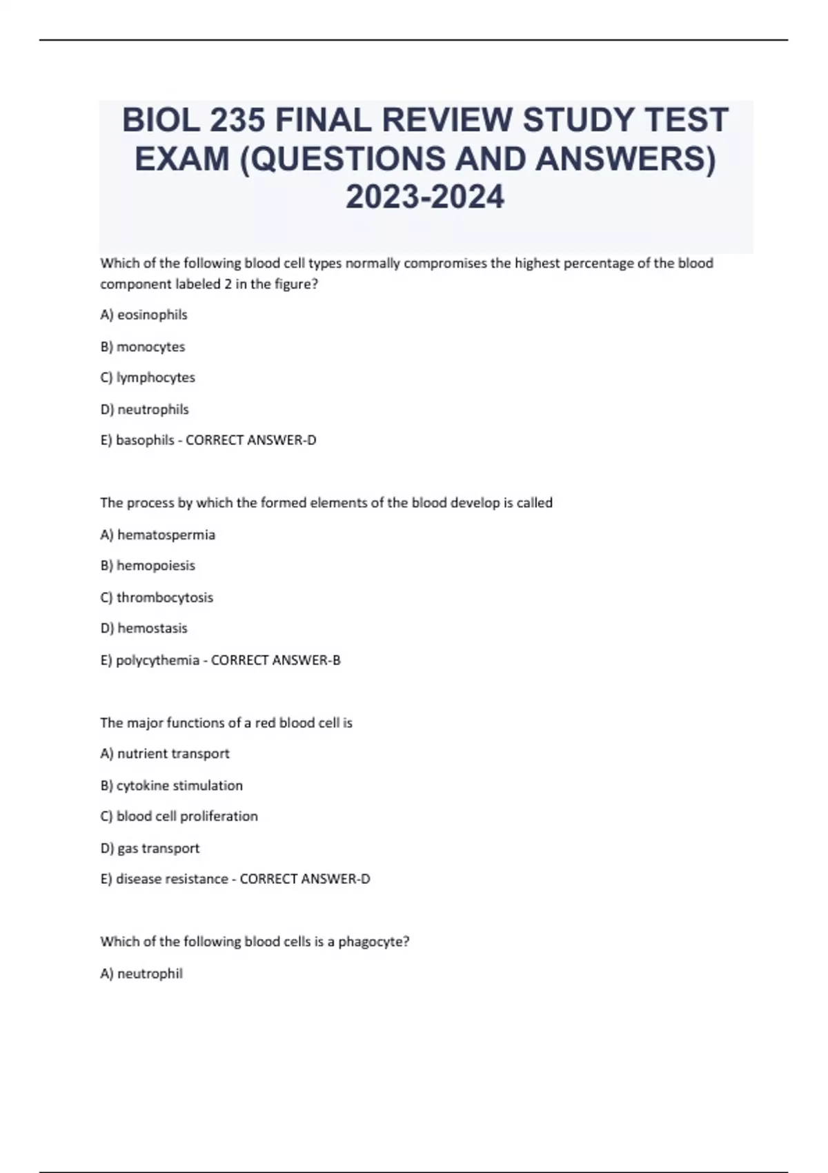 BIOL 235 FINAL REVIEW STUDY TEST EXAM (QUESTIONS AND ANSWERS) Which of the following blood cell types normally compromises the highest percentage of the blood component labeled 2 in the figure? A) eosinophils B) monocytes C) lymphocytes D) neutrophils E) basophils - CORRECT ANSWER-D The process by which the formed elements of the blood develop is called A) hematospermia B) hemopoiesis C) thrombocytosis D) hemostasis E) polycythemia - CORRECT ANSWER-B The major functions of a red blood cell is A) nutrient transport B) cytokine stimulation C) blood cell proliferation D) gas transport E) disease resistance - CORRECT ANSWER-D Which of the following blood cells is a phagocyte? A) neutrophil B) platelet C) lymphocyte D) basophil E) erythrocyte - CORRECT ANSWER-A Which of the following hormones stimulates the development of megakaryoblasts? A) erythropoietin B) thrombopoietin C) nitric oxide D) human growth hormone E) heparin - CORRECT ANSWER-B The intrinsic and extrinsic pathways of blood clotting are identical after formation of A) thromboplastin B) prothrombinase C) clotting factor XII D) fibrin E) tissue factor - CORRECT ANSWER-B Clotting of an unbroken blood vessel is called? A) embolism B) hemolysis C) fibrinolysis D) agglutination E) thrombosis - CORRECT ANSWER-E What blood type is a person if their plasma contains only anti-A agglutinin? A) A B) B C) O D) AB E) not enough information is provided to answer the question - CORRECT ANSWER-B The anatomical region found between the lungs that extends from the sternum to the vertebral column and from the first rib to the diaphragm? A) epicardium B) abdominal cavity C) pericardium D) mediastinum E) thoracic cavity - CORRECT ANSWER-D Through which structure does blood pass from the right atrium to the right ventricle? A) bicuspid valve B) interventricular septum C) tricuspid valve D) mitral valve E) ascending aorta - CORRECT ANSWER-C Which valve below prevents blood from flowing back into the right ventricle? A) tricuspid valve B) bicuspid valve C) pulmonary semilunar valve D) aortic semilunar valve E) mitral valve - CORRECT ANSWER-C Which structure in the figure is labeled C? - CORRECT ANSWER-arch of aorta Why does not a significant amount of blood flow back into the vena cava and coronary sinus during atrial contraction? A) the tricuspid valve blocks the venous openings B) the bicuspid valve blocks the venous openings C) the contraction of the atria compresses and closes the venous openings D) the semilunar valves block the venous openings E) the venous valves block the venous openings - CORRECT ANSWER-D Cardiac muscle fibers are electrically connected to neighboring fibers by... A) desmosomes B) tight junctions C) gap junctions D) interneurons E) chordae tendinae - CORRECT ANSWER-C Which of the following occurs at the beginning of the ventricular diastole? A) p wave B) r wave C) q wave D) qrs complex E) t wave - CORRECT ANSWER-D In comparison the skeletal muscle fibers, the contractile fibers of the heart are depolarized for ______ period of time. A) a shorter B) a longer C) the same - CORRECT ANSWER-B Which term refers to the period of time during a cardiac cycle when contraction of a chamber occurs and pressure within the chamber rises? A) filling B) systole C) repolarization D) diastole E) fibrillation - CORRECT ANSWER-B Which event occurs during ventricular systole? A) depolarization of the SA node B) isovolumetric contraction C) filling of the atria D) opening of the AV valves E) ventricular pressure drops - CORRECT ANSWER-B The frank starling law of the heart states that the heart is dependent upon the autonomic nervous system for a stimulus contract... A) the heart is dependent upon the autonomic nervous system for a stimulus to contract B) the absolute refractory period for the heart must be longer than the duration of contraction for efficient heart functioning C) the heart contracts to the fullest extent possible for the conditions, or not at all D) cardiac output equals heart rate multiplied by stroke volume - CORRECT ANSWER-D Which of the labeled layers in the diagram of the arterial wall consists mainly of elastic fibers and smooth muscle fibers? A) A B) B C) C D) A and B E) A, B, and C - CORRECT ANSWER-B