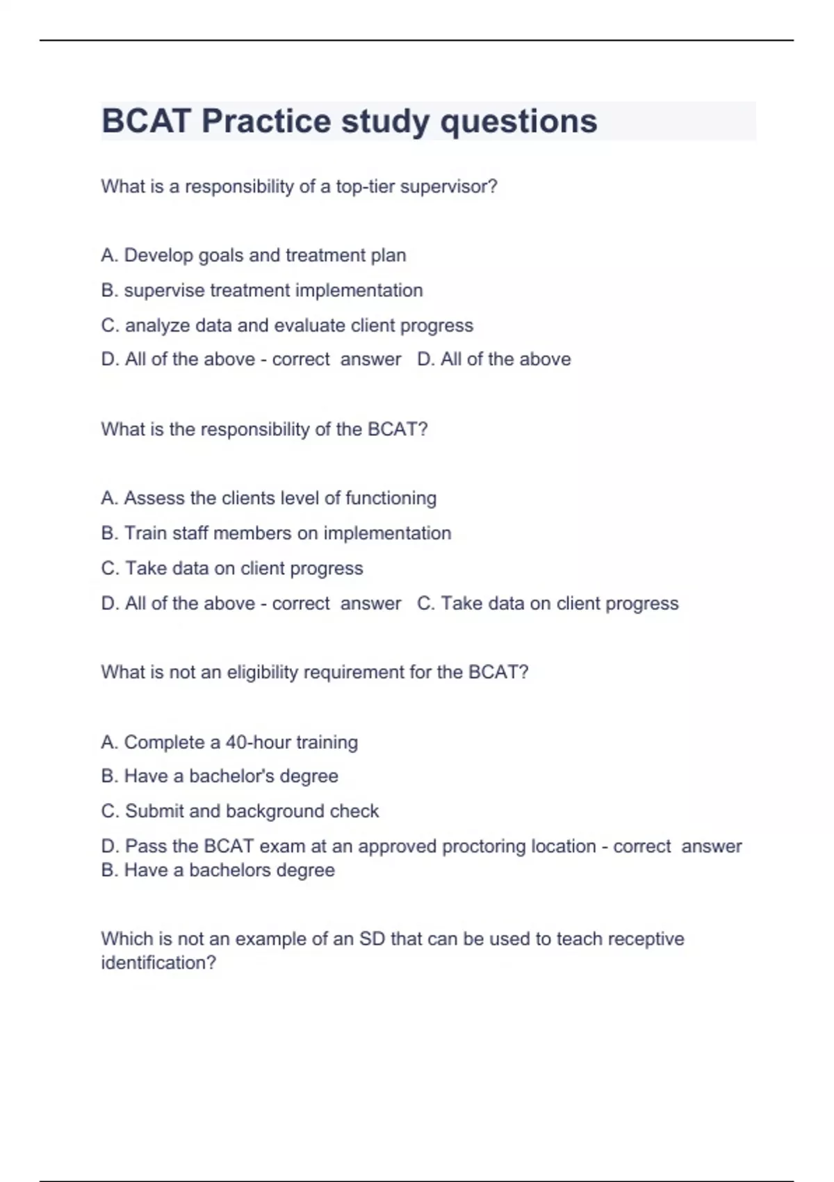 BCAT Practice study questions and answers already passed 2023/2024 What is a responsibility of a top-tier supervisor? A. Develop goals and treatment plan B. supervise treatment implementation C. analyze data and evaluate client progress D. All of the above - correct answer D. All of the above What is the responsibility of the BCAT? A. Assess the clients level of functioning B. Train staff members on implementation C. Take data on client progress D. All of the above - correct answer C. Take data on client progress What is not an eligibility requirement for the BCAT? A. Complete a 40-hour training B. Have a bachelor's degree C. Submit and background check D. Pass the BCAT exam at an approved proctoring location - correct answer B. Have a bachelors degree Which is not an example of an SD that can be used to teach receptive identification?