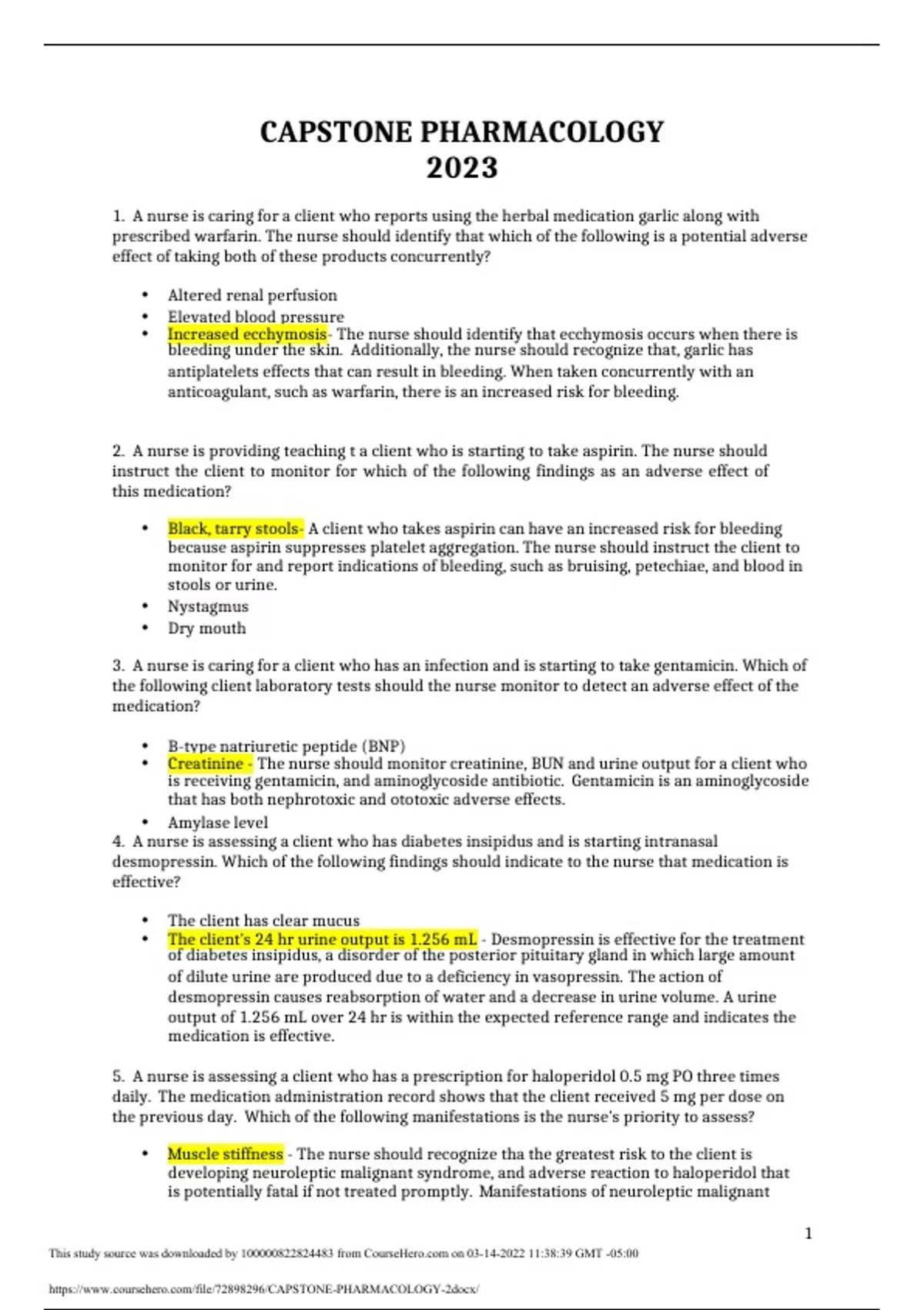 1. A nurse is caring for a client who reports using the herbal medication garlic along with prescribed warfarin. The nurse should identify that which of the following is a potential adverse effect of taking both of these products concurrently? • Altered renal perfusion • Elevated blood pressure • Increased ecchymosis- The nurse should identify that ecchymosis occurs when there is bleeding under the skin. Additionally, the nurse should recognize that, garlic has antiplatelets effects that can result in bleeding. When taken concurrently with an anticoagulant, such as warfarin, there is an increased risk for bleeding. 2. A nurse is providing teaching t a client who is starting to take aspirin. The nurse should instruct the client to monitor for which of the following findings as an adverse effect of this medication? • Black, tarry stools- A client who takes aspirin can have an increased risk for bleeding because aspirin suppresses platelet aggregation. The nurse should instruct the client to monitor for and report indications of bleeding, such as bruising, petechiae, and blood in stools or urine. • Nystagmus • Dry mouth 3. A nurse is caring for a client who has an infection and is starting to take gentamicin. Which of the following client laboratory tests should the nurse monitor to detect an adverse effect of the medication? • B-type natriuretic peptide (BNP) • Creatinine - The nurse should monitor creatinine, BUN and urine output for a client who is receiving gentamicin, and aminoglycoside antibiotic. Gentamicin is an aminoglycoside that has both nephrotoxic and ototoxic adverse effects. • Amylase level 4. A nurse is assessing a client who has diabetes insipidus and is starting intranasal desmopressin. Which of the following findings should indicate to the nurse that medication is effective? • The client has clear mucus • The client’s 24 hr urine output is 1.256 mL - Desmopressin is effective for the treatment of diabetes insipidus, a disorder of the posterior pituitary gland in which large amount of dilute urine are produced due to a deficiency in vasopressin. The action of desmopressin causes reabsorption of water and a decrease in urine volume. A urine output of 1.256 mL over 24 hr is within the expected reference range and indicates the medication is effective. 5. A nurse is assessing a client who has a prescription for haloperidol 0.5 mg PO three times daily. The medication administration record shows that the client received 5 mg per dose on the previous day. Which of the following manifestations is the nurse’s priority to assess? • Muscle stiffness - The nurse should recognize tha the greatest risk to the client is developing neuroleptic malignant syndrome, and adverse reaction to haloperidol that is potentially fatal if not treated promptly. Manifestations of neuroleptic malignant 1 This study source was downloaded by from CourseH on :38:39 GMT -05:00 syndrome include extreme muscle stiffness, sudden increase in temperature, diaphoresis, dysrhythmias, and fluctuations in blood pressure. • Blurred vision • Constipation