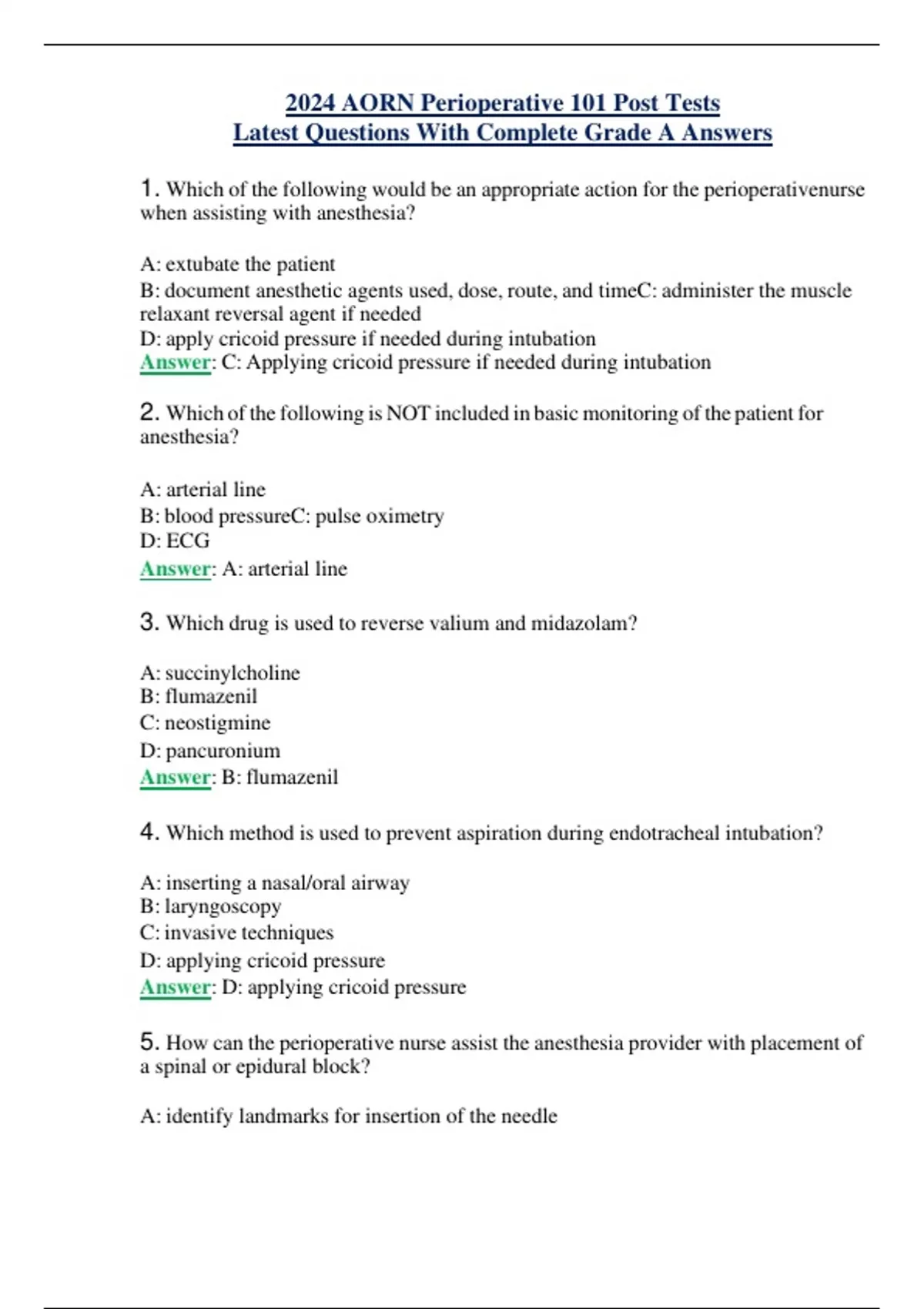 2024 AORN Perioperative 101 Post Tests Latest Questions With Complete Grade A Answers 1. Which of the following would be an appropriate action for the perioperativenurse when assisting with anesthesia? A: extubate the patient B: document anesthetic agents used, dose, route, and timeC: administer the muscle relaxant reversal agent if needed D: apply cricoid pressure if needed during intubation Answer: C: Applying cricoid pressure if needed during intubation 2. Which of the following is NOT included in basic monitoring of the patient for anesthesia? A: arterial line B: blood pressureC: pulse oximetry D: ECG Answer: A: arterial line 3. Which drug is used to reverse valium and midazolam? A:succinylcholine B: flumazenil C: neostigmine D: pancuronium Answer: B: flumazenil 4. Which method is used to prevent aspiration during endotracheal intubation? A: inserting a nasal/oral airway B: laryngoscopy C: invasive techniques D: applying cricoid pressure Answer: D: applying cricoid pressure 5. How can the perioperative nurse assist the anesthesia provider with placement of a spinal or epidural block? A: identify landmarks for insertion of the needle B: thread the catheter through the needle C: inject local anesthetic D: calm the patient Answer: D: calm the patient