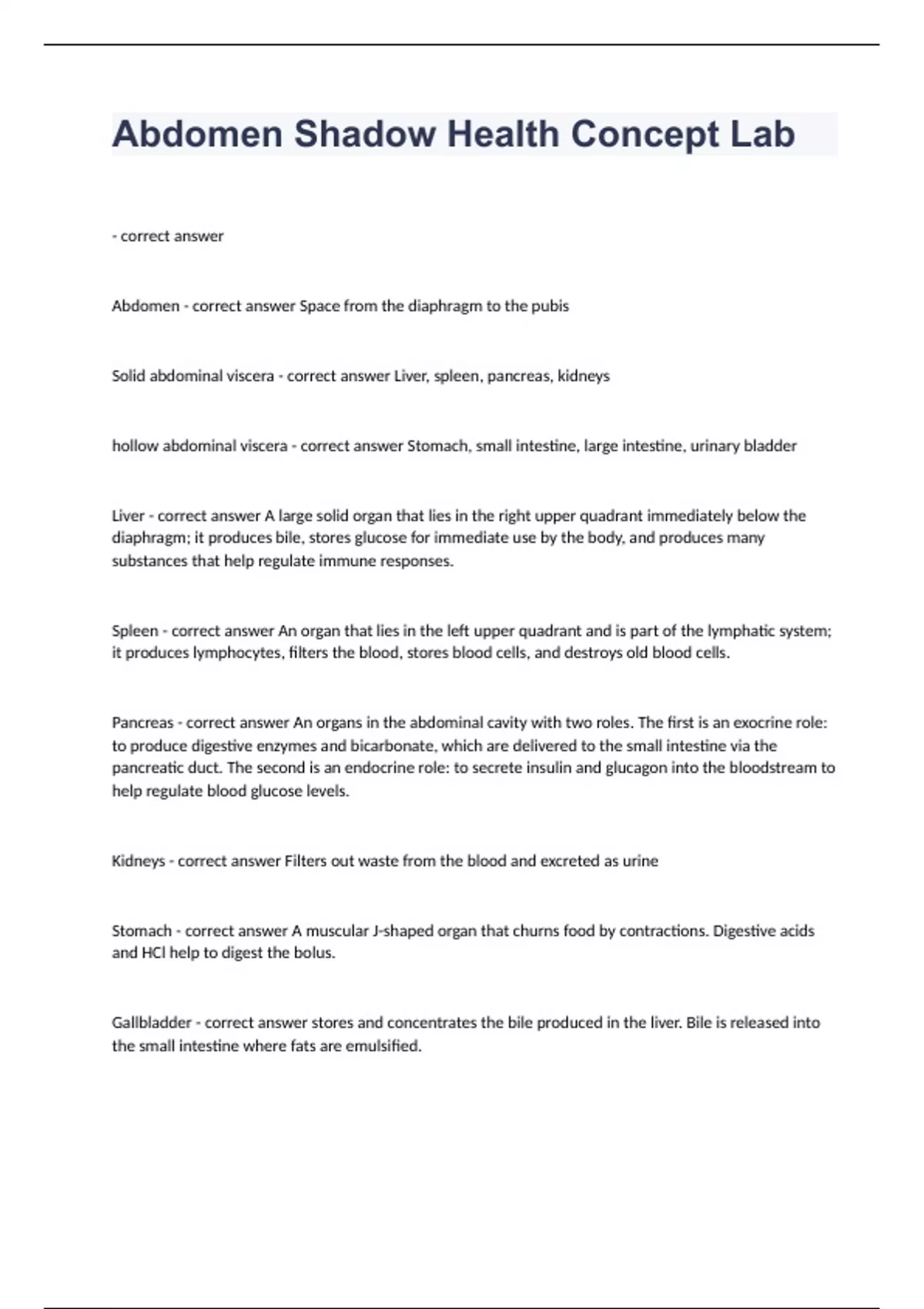 Abdomen Shadow Health Concept Lab- correct answer Abdomen - correct answer Space from the diaphragm to the pubis Solid abdominal viscera - correct answer Liver, spleen, pancreas, kidneys hollow abdominal viscera - correct answer Stomach, small intestine, large intestine, urinary bladder Liver - correct answer A large solid organ that lies in the right upper quadrant immediately below the diaphragm; it produces bile, stores glucose for immediate use by the body, and produces many substances that help regulate immune responses. Spleen - correct answer An organ that lies in the left upper quadrant and is part of the lymphatic system; it produces lymphocytes, filters the blood, stores blood cells, and destroys old blood cells. Pancreas - correct answer An organs in the abdominal cavity with two roles. The first is an exocrine role: to produce digestive enzymes and bicarbonate, which are delivered to the small intestine via the pancreatic duct. The second is an endocrine role: to secrete insulin and glucagon into the bloodstream to help regulate blood glucose levels. Kidneys - correct answer Filters out waste from the blood and excreted as urine Stomach - correct answer A muscular J-shaped organ that churns food by contractions. Digestive acids and HCl help to digest the bolus. Gallbladder - correct answer stores and concentrates the bile produced in the liver. Bile is released into the small intestine where fats are emulsified. Small intestine - correct answer The site where the most digestion and absorption takes place. Bile and pancreatic juice work to break down chyme. Colon - correct answer AKA the large intestine, it is the site where water, salt, an some nutrients are absorbed Urinary bladder - correct answer hollow, muscular sac that holds and stores urine when the muscle contracts urine is eliminated through the urethra. Abdominal aorta - correct answer Oxygenated blood is supplied to the abdominal viscera through this Right lower quadrant - correct answer Contains the appendix, right ureter, and parts of the ascending colon 4 abdominal quadrants - correct answer RUQ, LUQ, RLQ, LLQ Right upper quadrant - correct answer Contains the liver, gallbladder, duodenum, head of the pancreas, right kidney, and sections of the large intestine Left upper quadrant - correct answer Contains the stomach, spleen, left lobe of the liver, and sections of the colon Left lower quadrant - correct answer Contains the left ureter, sigmoid colon, parts of the descending colon Empty bladder - correct answer Before you begin the objective abdominal assessment ask the patient to do this Supine position - correct answer Position for the abdominal assessment last - correct answer When should you examine painful areas