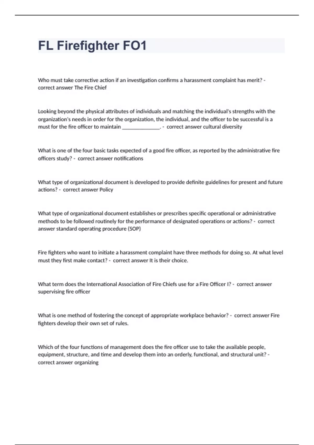 FL Firefighter FO1Who must take corrective action if an investigation confirms a harassment complaint has merit? - correct answer The Fire Chief Looking beyond the physical attributes of individuals and matching the individual's strengths with the organization's needs in order for the organization, the individual, and the officer to be successful is a must for the fire officer to maintain _____________. - correct answer cultural diversity What is one of the four basic tasks expected of a good fire officer, as reported by the administrative fire officers study? - correct answer notifications What type of organizational document is developed to provide definite guidelines for present and future actions? - correct answer Policy What type of organizational document establishes or prescribes specific operational or administrative methods to be followed routinely for the performance of designated operations or actions? - correct answer standard operating procedure (SOP) Fire fighters who want to initiate a harassment complaint have three methods for doing so. At what level must they first make contact? - correct answer It is their choice. What term does the International Association of Fire Chiefs use for a Fire Officer I? - correct answer supervising fire officer What is one method of fostering the concept of appropriate workplace behavior? - correct answer Fire fighters develop their own set of rules. Which of the four functions of management does the fire officer use to take the available people, equipment, structure, and time and develop them into an orderly, functional, and structural unit? - correct answer organizing What are the primary causes of death to fire fighters operating in a burning structure? - correct answer flash over and structural collapse Which of the four functions of management deals with developing a scheme, program, or method that is worked out beforehand to accomplish an objective? - correct answer planning Which of the four functions of management is used when a fire officer considers the impact on the budget before making purchases? - correct answer controlling Most experts believe that span of control should extend to no more than a specific number of people. What is that number? - correct answer 5 Human resource management is built from two generalized schools of management thought. What is one of those schools? - correct answer scientific According to the NFPA, about what percentage of American fire fighters are volunteers? - correct answer 72% If fire officers have the authority to solve a given problem that has come up, what should they do about involving their supervisors first? - correct answer Nothing; they should go ahead and make a decision. Fire officers should consult their supervisors if they are going to make a decision that __________________. - correct answer goes beyond their scope of authority When an officer tells subordinates that he does not agree with unpopular orders, but the orders have to be enforced anyway, what is the result? - correct answer The officer's authority and supervisory ability is undermined. What type of organizations do private industries or nongovernmental organizations use to provide fire protection to factories, processing plants, and large private facilities? - correct answer fire brigades What is the lowest level of fire officer that could be in a chief officer position? - correct answer III