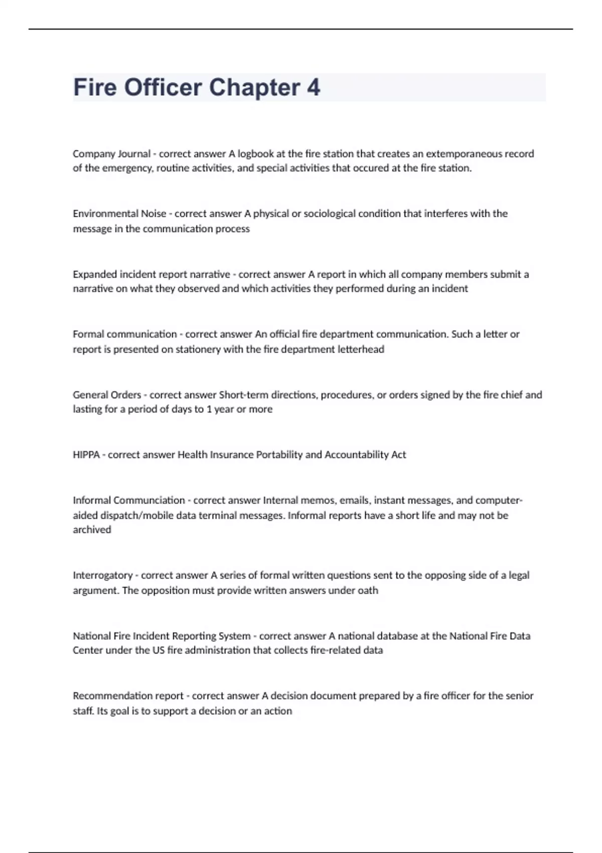 Fire Officer Chapter 4 Company Journal - correct answer A logbook at the fire station that creates an extemporaneous record of the emergency, routine activities, and special activities that occured at the fire station. Environmental Noise - correct answer A physical or sociological condition that interferes with the message in the communication process Expanded incident report narrative - correct answer A report in which all company members submit a narrative on what they observed and which activities they performed during an incident Formal communication - correct answer An official fire department communication. Such a letter or report is presented on stationery with the fire department letterhead General Orders - correct answer Short-term directions, procedures, or orders signed by the fire chief and lasting for a period of days to 1 year or more HIPPA - correct answer Health Insurance Portability and Accountability Act Informal Communciation - correct answer Internal memos, emails, instant messages, and computer-aided dispatch/mobile data terminal messages. Informal reports have a short life and may not be archived Interrogatory - correct answer A series of formal written questions sent to the opposing side of a legal argument. The opposition must provide written answers under oath National Fire Incident Reporting System - correct answer A national database at the National Fire Data Center under the US fire administration that collects fire-related data Recommendation report - correct answer A decision document prepared by a fire officer for the senior staff. Its goal is to support a decision or an action Social Media - correct answer Digital Communication through which users create online communities to share information, ideas, personal messages, videos, pictures, and other content Standard Operating Guidelines - correct answer Written organizational directives that identify a desired goal and describe the general path to accomplish the goal, including critical tasks of caution Standard Operating Procedure - correct answer Written organizational directives that establish or prescribe specific operational or administrative methods to be followed routinely for the performance of designated operations or actions Supervisors Report - correct answer A form that is required by most state workers compensation agencies that is completed by the immediate supervisor after and injury or property damage accident 5 parts of the communication cycle - correct answer 1. Message 2. Sender 3. Medium (with noise) 4. Receiver 5. Feedback It its purest form, what does the message contain - correct answer Only the information to be conveyed What is successful communication - correct answer When 2 people can exchange information and develop mutual understanding Sender - correct answer Person or entity who is sending the message The Medium - correct answer The method used to convey the information from the sender to the receiver. A fire officer must be able to process several types of _________ to supervise and support the fire company members effectively - correct answer Information