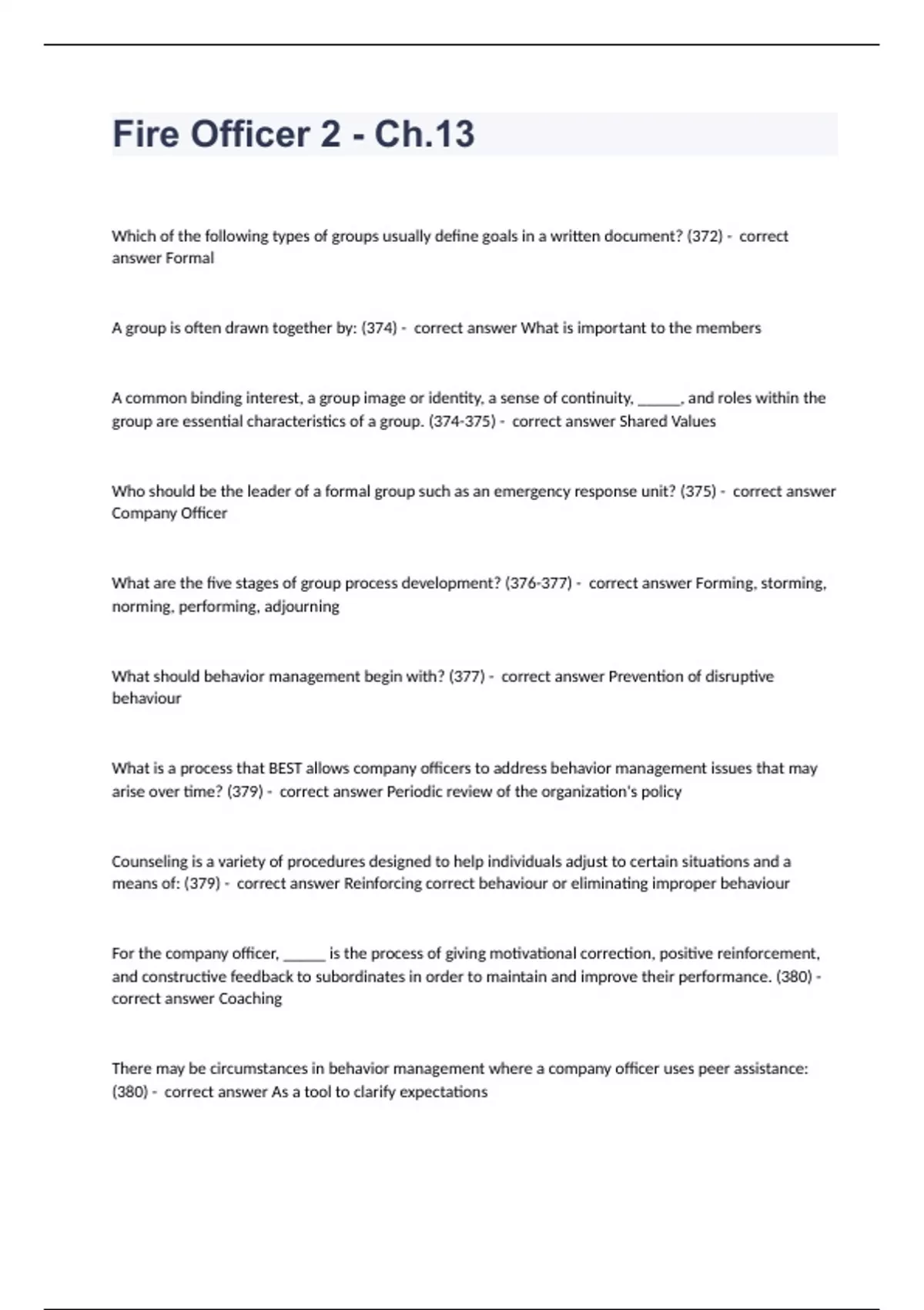 Fire Officer 2 - Ch.13Which of the following types of groups usually define goals in a written document? (372) - correct answer Formal A group is often drawn together by: (374) - correct answer What is important to the members A common binding interest, a group image or identity, a sense of continuity, _____, and roles within the group are essential characteristics of a group. (374-375) - correct answer Shared Values Who should be the leader of a formal group such as an emergency response unit? (375) - correct answer Company Officer What are the five stages of group process development? (376-377) - correct answer Forming, storming, norming, performing, adjourning What should behavior management begin with? (377) - correct answer Prevention of disruptive behaviour What is a process that BEST allows company officers to address behavior management issues that may arise over time? (379) - correct answer Periodic review of the organization's policy Counseling is a variety of procedures designed to help individuals adjust to certain situations and a means of: (379) - correct answer Reinforcing correct behaviour or eliminating improper behaviour For the company officer, _____ is the process of giving motivational correction, positive reinforcement, and constructive feedback to subordinates in order to maintain and improve their performance. (380) - correct answer Coaching There may be circumstances in behavior management where a company officer uses peer assistance: (380) - correct answer As a tool to clarify expectations When would a person MOST likely be formally evaluated? (381-382) - correct answer Annually as part of a performance review When are employees MOST likely to file grievances? (386) - correct answer When they perceive they have been unfairly treated What are the three levels of progressive discipline? (387-388) - correct answer Preventative, corrective, punitive Which of the following is the key to growth, not only for the employee, but in helping the organization develop future leaders in the organization's succession plan? (389) - correct answer Professional development What are three steps to identify and include in the career planning process? (390) - correct answer Current situation, intermediate objectives, final goal Before advancing to the next position or rank, personnel must: (391) - correct answer Be proficient in their current position A group is often defined as a collection of people who do four things. What are they? (372) - correct answer Share traits Interact Accept obligations as members Share common identity Name three things that discipline is designed to do in the fire and emergency services. (386) - correct answer Educate and train Correct behaviour Provide direction
