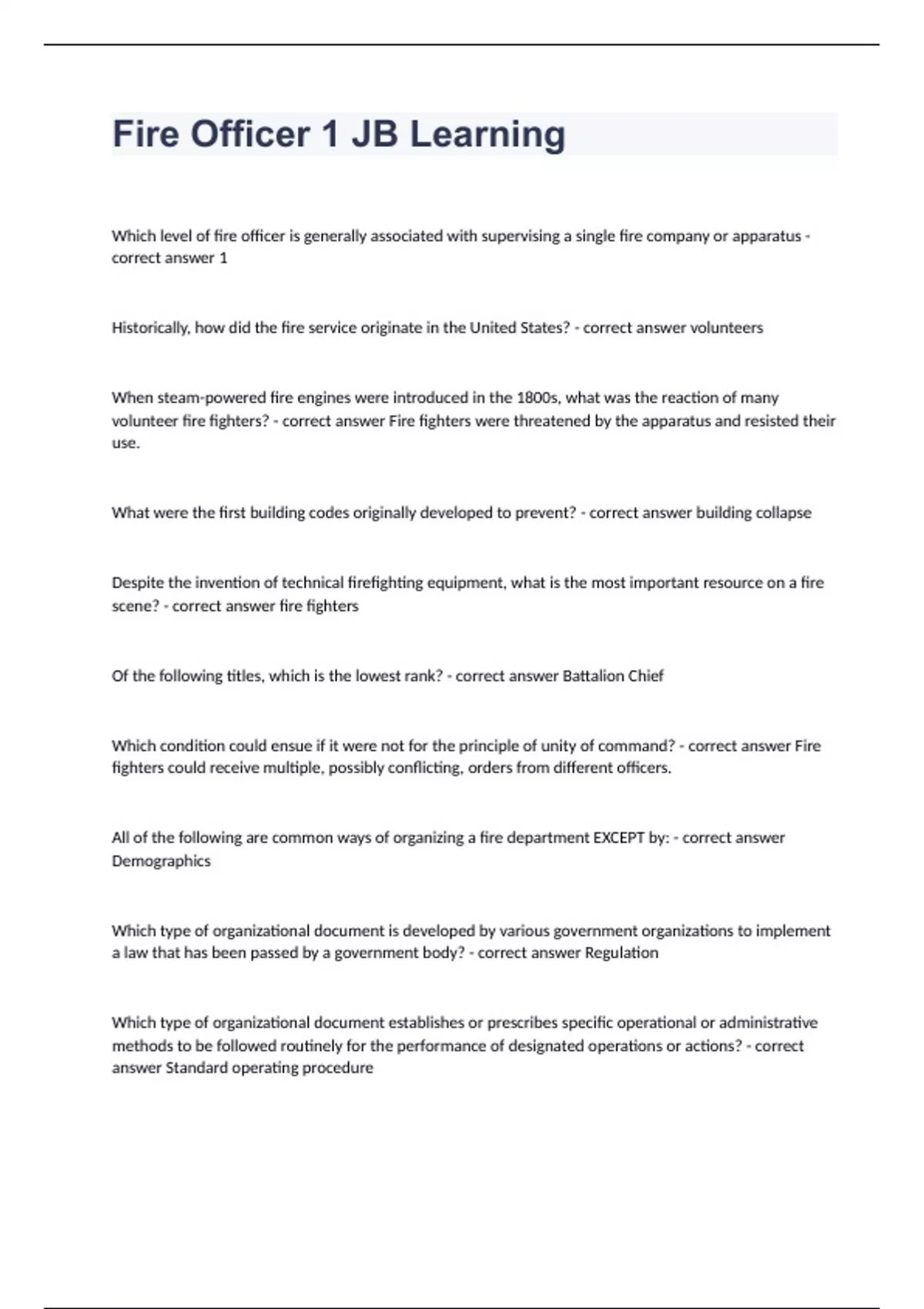 Fire Officer 1 JB Learning Which level of fire officer is generally associated with supervising a single fire company or apparatus - correct answer 1 Historically, how did the fire service originate in the United States? - correct answer volunteers When steam-powered fire engines were introduced in the 1800s, what was the reaction of many volunteer fire fighters? - correct answer Fire fighters were threatened by the apparatus and resisted their use. What were the first building codes originally developed to prevent? - correct answer building collapse Despite the invention of technical firefighting equipment, what is the most important resource on a fire scene? - correct answer fire fighters Of the following titles, which is the lowest rank? - correct answer Battalion Chief Which condition could ensue if it were not for the principle of unity of command? - correct answer Fire fighters could receive multiple, possibly conflicting, orders from different officers. All of the following are common ways of organizing a fire department EXCEPT by: - correct answer Demographics Which type of organizational document is developed by various government organizations to implement a law that has been passed by a government body? - correct answer Regulation Which type of organizational document establishes or prescribes specific operational or administrative methods to be followed routinely for the performance of designated operations or actions? - correct answer Standard operating procedure What is the term for the ability of a test to measure what it is intended to measure on a consistent basis? - correct answer Reliability If a promotion eligibility list is banded, what is typically one of the group headings? - correct answer Qualified To be effective in a role-playing exercise, a candidate's supervisory decisions should be strictly based on: - correct answer policies and regulations. In general, which level of supervisor has the longest and most diverse reading list for its promotional multiple-choice examinations? - correct answer First-level Hidden within the assessment center in-basket papers are usually a few surprises, including a few _____________ items. - correct answer time-sensitive Which of the following roles is commonly encountered in an assessment center role-play simulation? - correct answer Angry citizen In preparing for examination, candidates should be familiar with the materials on the reference reading list as well as: - correct answer recent local history. Which item should be included in a personal study journal? - correct answer A calendar Which document is used by the human resources department to summarize the scope of the job and provide examples of the typical tasks a person holding that position might be expected to perform? - correct answer Job description Which type of information is included in the first part of a "beginning of shift report"? - correct answer Staffing report Which statement best summarizes the role of the supervising fire officer in decision making and problem solving? - correct answer Chiefs will be available for consultation, but the fire officers will run their stations.