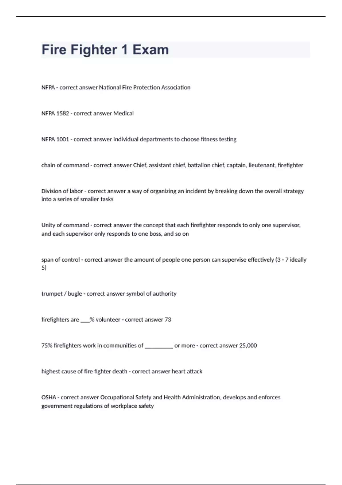 Fire Fighter 1 ExamNFPA - correct answer National Fire Protection Association NFPA 1582 - correct answer Medical NFPA 1001 - correct answer Individual departments to choose fitness testing chain of command - correct answer Chief, assistant chief, battalion chief, captain, lieutenant, firefighter Division of labor - correct answer a way of organizing an incident by breaking down the overall strategy into a series of smaller tasks Unity of command - correct answer the concept that each firefighter responds to only one supervisor, and each supervisor only responds to one boss, and so on span of control - correct answer the amount of people one person can supervise effectively (3 - 7 ideally 5) trumpet / bugle - correct answer symbol of authority firefighters are ___% volunteer - correct answer 73 75% firefighters work in communities of _________ or more - correct answer 25,000 highest cause of fire fighter death - correct answer heart attack OSHA - correct answer Occupational Safety and Health Administration, develops and enforces government regulations of workplace safety freelancing - correct answer acting independently of orders or SOPs personal accountability system - correct answer a system used to track personnel and assignments 3 layers of turnout gear - correct answer outer layer: constructed of, sturdy, flame resistant, water repellant material second layer: moisture barrier that helps prevent transfer of water, steam, and other fluids to the skin third layer: thermal barrier that insulates the body from external temperatures boots must be at least _____ inches tall and constructed of __________ or ____________ - correct answer 8, rubber, leather PASS - correct answer personal alert safety system, an electronic device that sounds a loud signal when a firefighter becomes motionless component of smoke - correct answer particles, vapor, gases carbon monoxide - correct answer a toxic gas produced through incomplete combustion hydrogen cyanide - correct answer is formed when plastic burns phosgene - correct answer a gas formed from incomplete combustion of common household products open circuit breathing apparatus - correct answer a compressed air cylinder provides air for the user, and exhaled air is released into the atmosphere closed circuit breathing apparatus - correct answer recycles the user's exhaled air
