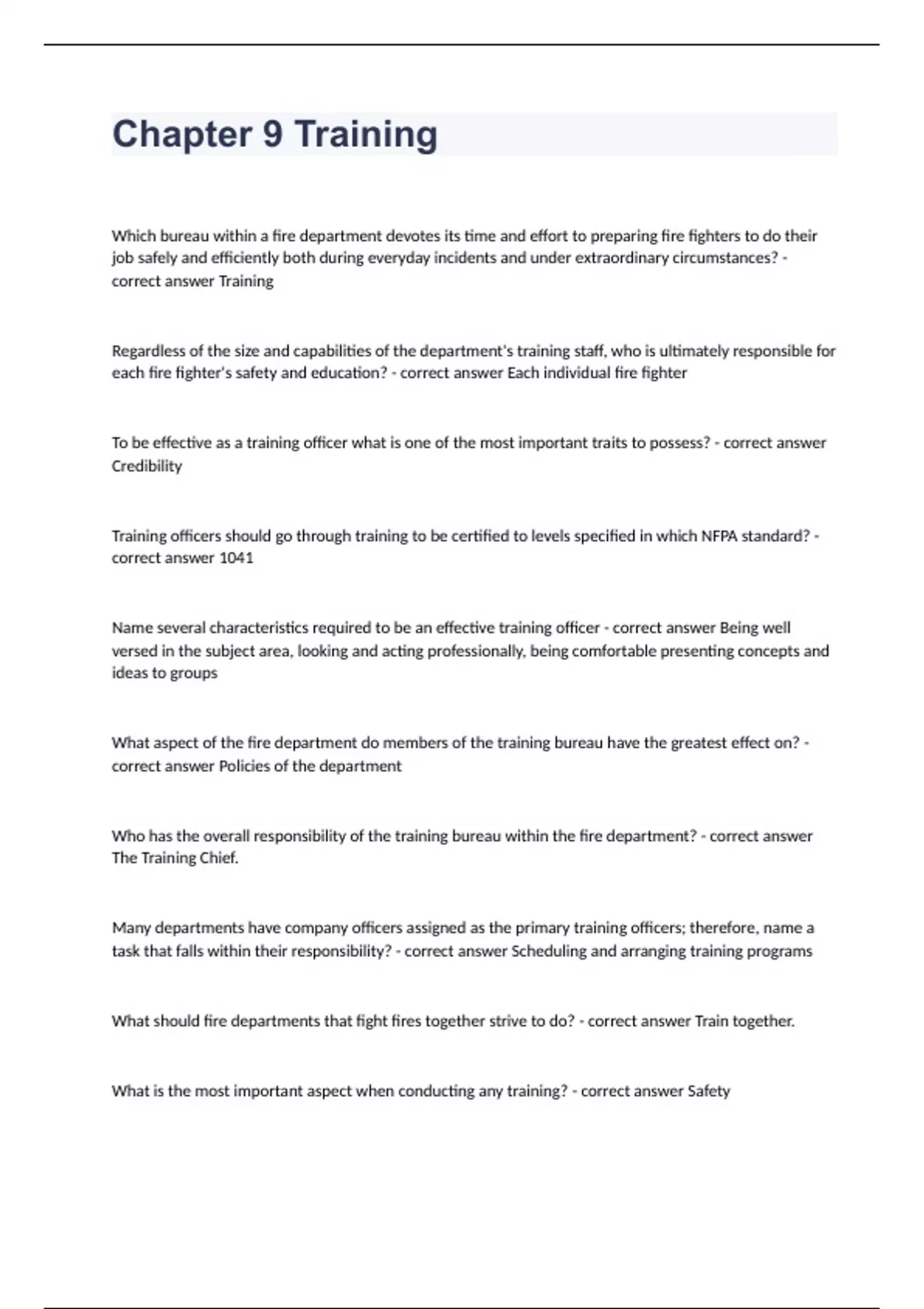 Chapter 9 TrainingWhich bureau within a fire department devotes its time and effort to preparing fire fighters to do their job safely and efficiently both during everyday incidents and under extraordinary circumstances? - correct answer Training Regardless of the size and capabilities of the department's training staff, who is ultimately responsible for each fire fighter's safety and education? - correct answer Each individual fire fighter To be effective as a training officer what is one of the most important traits to possess? - correct answer Credibility Training officers should go through training to be certified to levels specified in which NFPA standard? - correct answer 1041 Name several characteristics required to be an effective training officer - correct answer Being well versed in the subject area, looking and acting professionally, being comfortable presenting concepts and ideas to groups What aspect of the fire department do members of the training bureau have the greatest effect on? - correct answer Policies of the department Who has the overall responsibility of the training bureau within the fire department? - correct answer The Training Chief. Many departments have company officers assigned as the primary training officers; therefore, name a task that falls within their responsibility? - correct answer Scheduling and arranging training programs What should fire departments that fight fires together strive to do? - correct answer Train together. What is the most important aspect when conducting any training? - correct answer Safety What occurs in a classroom environment where students are comfortable and distractions are limited? - correct answer Better learning. Which kinds of props are expensive to construct and include items such as leaking pipes and railroad cars? - correct answer Hazardous Materials Props How does observing new building construction benefit companies assigned to the district where the construction is occurring? - correct answer It acquaints engine and truck company personnel with construction methods What is the primary purpose of instruction? - correct answer To change behavior. Some of the fire fighter's jobs are practiced to the point that they become habit. List several tasks fire fighters should make a habit. - correct answer Properly donning self-contained breathing apparatus, Sizing up the incident, Ensuring overall safety As a firefighter, how can you develop "Command Presence"? - correct answer By training yourself from the very beginning to think in a logical and orderly fashion in emergency situations. What can technical knowledge of a flashover do for you? - correct answer It can save your life. State several concepts of manipulative training. - correct answer Trial and error is not conducive to good performance, You are closely watched and corrected as you perform, Perfect practice leads to perfect performance. Describe several factors that should be applied to performance standards. - correct answer Completed in a timely manner, in a safe manner and with minimum errors. When it comes to safety, the acceptable error level is 0 percent, what is this also referred to? - correct answer Zero Tolerance