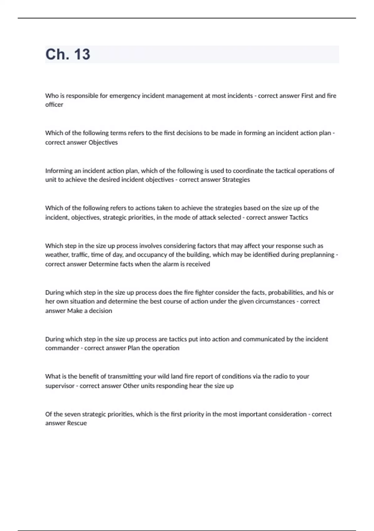 Ch. 13Who is responsible for emergency incident management at most incidents - correct answer First and fire officer Which of the following terms refers to the first decisions to be made in forming an incident action plan - correct answer Objectives Informing an incident action plan, which of the following is used to coordinate the tactical operations of unit to achieve the desired incident objectives - correct answer Strategies Which of the following refers to actions taken to achieve the strategies based on the size up of the incident, objectives, strategic priorities, in the mode of attack selected - correct answer Tactics Which step in the size up process involves considering factors that may affect your response such as weather, traffic, time of day, and occupancy of the building, which may be identified during preplanning - correct answer Determine facts when the alarm is received During which step in the size up process does the fire fighter consider the facts, probabilities, and his or her own situation and determine the best course of action under the given circumstances - correct answer Make a decision During which step in the size up process are tactics put into action and communicated by the incident commander - correct answer Plan the operation What is the benefit of transmitting your wild land fire report of conditions via the radio to your supervisor - correct answer Other units responding hear the size up Of the seven strategic priorities, which is the first priority in the most important consideration - correct answer Rescue Of the seven strategic priorities, which involves stopping the spread of the incident - correct answer Confinement Of the seven strategic priorities, which is the act of putting the fire out or stopping the source of the leak any hazardous materials incident - correct answer Extinguishment Of the seven strategic priorities, which is dirty and non-glamorous, but essential to ensuring the fire does not rekindle - correct answer Overhaul Which motive attack is often used on small fires or incidents where firefighters are at minimal risk - correct answer Offensive mode Which mode of attack is used to protect exposures structure has collapsed or a collapse is imminent - correct answer Defensive mode Which mode of attack requires careful coordination and should not be used for interior attack structural firefighting - correct answer Combination mode Which of the following terms refers to the direction and employment of resources to achieve a set objective, such as performing ventilation to control fire spread - correct answer Tactics Jobs that are necessary to achieve the tactics and that should be completed in a specific period of time are called - correct answer Tasks In response to the attacks of September 11, 2001, which document was issued by then President George W. Bush, calling for the national incident management system - correct answer HSPD-5 The incident command system allows users to adopt what type of structure to match the complexities and demands a single or multiple incidents without being hindered by jurisdictional boundaries - correct answer Integrated organizational structure What organization developed the first incident command system in the 1970s following a series of catastrophic fires in California is urban interface - correct answer FIRESCOPE