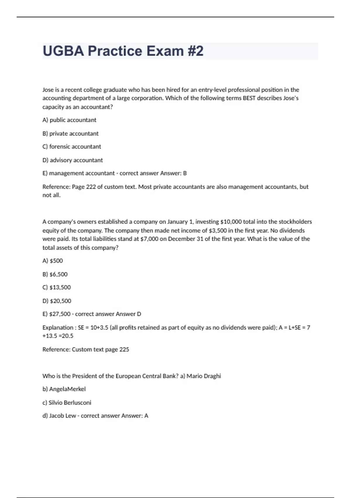 UGBA Practice Exam #2Jose is a recent college graduate who has been hired for an entry-level professional position in the accounting department of a large corporation. Which of the following terms BEST describes Jose's capacity as an accountant? A) public accountant B) private accountant C) forensic accountant D) advisory accountant E) management accountant - correct answer Answer: B Reference: Page 222 of custom text. Most private accountants are also management accountants, but not all. A company's owners established a company on January 1, investing $10,000 total into the stockholders equity of the company. The company then made net income of $3,500 in the first year. No dividends were paid. Its total liabilities stand at $7,000 on December 31 of the first year. What is the value of the total assets of this company? A) $500 B) $6,500 C) $13,500 D) $20,500 E) $27,500 - correct answer Answer D Explanation : SE = 10+3.5 (all profits retained as part of equity as no dividends were paid); A = L+SE = 7 +13.5 =20.5 Reference: Custom text page 225 Who is the President of the European Central Bank? a) Mario Draghi b) AngelaMerkel c) Silvio Berlusconi d) Jacob Lew - correct answer Answer: A Which of the following statements is TRUE? A) As common practice, a union representative for the workers at a firm receives information from the firm's financial accounting system. B) As common practice, a union representative for the workers at a firm receives information from the firm's managerial accounting system. C) As common practice, a union representative for the workers at a firm receives information from both the firm's managerial accounting system and its financial accounting system. - correct answer Answer: A Explanation: A) The financial accounting system is concerned with external users, such as unions. Reference: Custom text page 219 - "A firm's financial accounting system is concerned with external information users: consumer groups, unions..." Which of the following refers to the financial statement detailing a firm's assets, liabilities, and owners' equity? A) income statement B) statement of cash flows C) balance sheet D) expense report E) annual budget - correct answer Answer: C Explanation: C) A balance sheet uses the accounting equation to show the current value of a company. Reference: custom text page 226, first line. Which of the following terms refers to any economic resource that is expected to benefit a firm or individual who owns it? A) asset B) liability C) equity D) account E) deposit - correct answer Answer: A Reference: custom text page 225, first line.