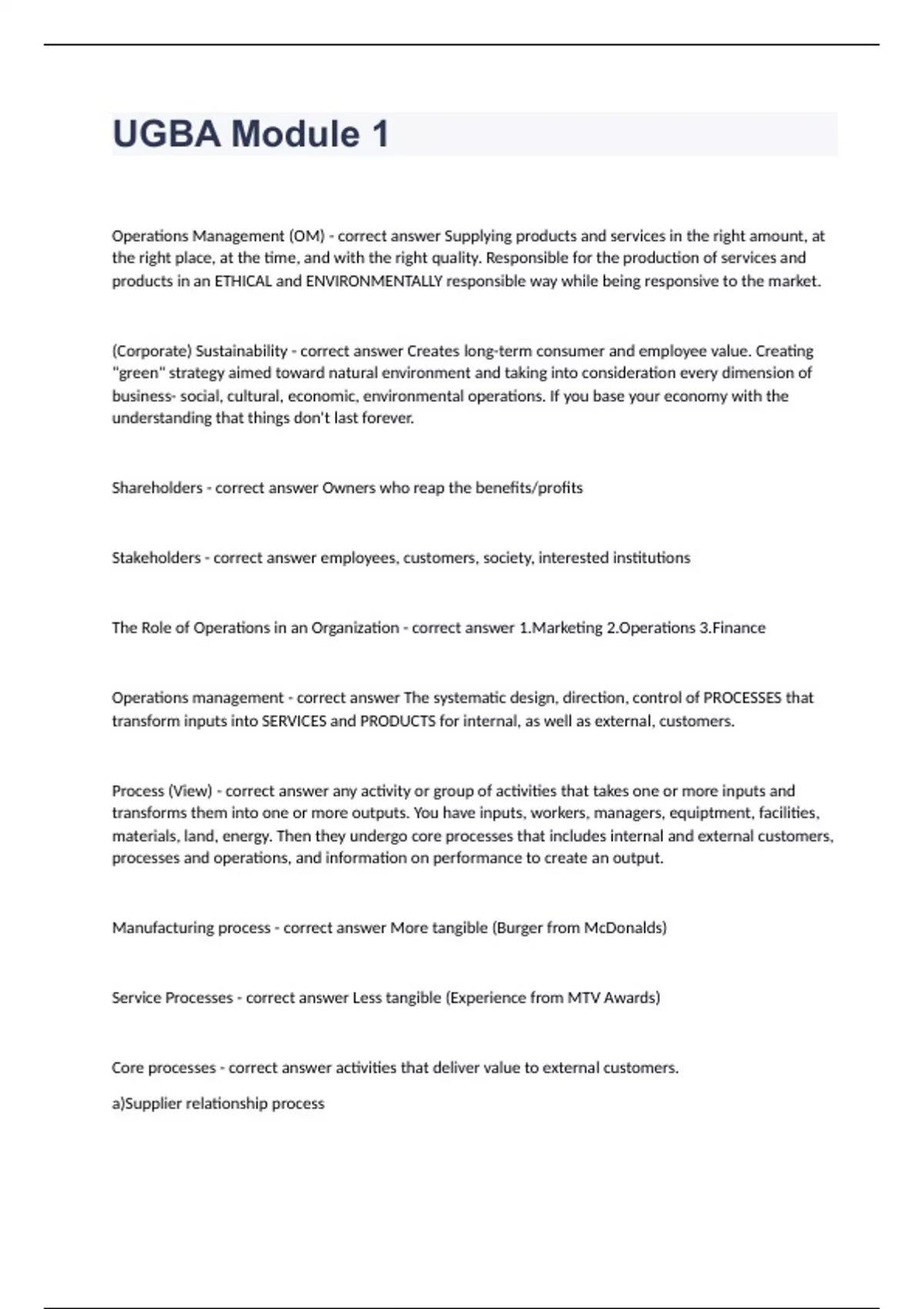 UGBA Module 1Operations Management (OM) - correct answer Supplying products and services in the right amount, at the right place, at the time, and with the right quality. Responsible for the production of services and products in an ETHICAL and ENVIRONMENTALLY responsible way while being responsive to the market. (Corporate) Sustainability - correct answer Creates long-term consumer and employee value. Creating "green" strategy aimed toward natural environment and taking into consideration every dimension of business- social, cultural, economic, environmental operations. If you base your economy with the understanding that things don't last forever. Shareholders - correct answer Owners who reap the benefits/profits Stakeholders - correct answer employees, customers, society, interested institutions The Role of Operations in an Organization - correct answer 1.Marketing 2.Operations 3.Finance Operations management - correct answer The systematic design, direction, control of PROCESSES that transform inputs into SERVICES and PRODUCTS for internal, as well as external, customers. Process (View) - correct answer any activity or group of activities that takes one or more inputs and transforms them into one or more outputs. You have inputs, workers, managers, equiptment, facilities, materials, land, energy. Then they undergo core processes that includes internal and external customers, processes and operations, and information on performance to create an output. Manufacturing process - correct answer More tangible (Burger from McDonalds) Service Processes - correct answer Less tangible (Experience from MTV Awards) Core processes - correct answer activities that deliver value to external customers. a)Supplier relationship process b) New service/product development c) order fulfillment process d)customer relationship process support processes - correct answer Vital resources and inputs to core processes (ex. HR, engineering, information system.) Supply chain view - correct answer not only about expanding boundaries but synchronizing management to match with the firm's processes including suppliers and customers, matching flows of materials, services, info, and demand. Corporate Strategy - correct answer Link between corporate strategy and key operations management decisions. provides an overall direction, serves as framework for carrying out organizations functions. **combines operations, marketing, finance Parts of corporate strategy - correct answer 1. Environmental Scanning a)Key trends in the industry, marketplace, and society b)Understanding economic trends, tech changes, political conditions 2.Core Competencies a)Identifying the unique resources and strengths b)Ex: workforce (well trained), well located facilities, deep understanding of market and finance sector, cutting edge technology 3.Core Processes a)To drive core competencies b)Ex: customer relationship, new product development, order fulfillment, supplier relationship 4.Global Strategies a)Having a response to global trends, opportunities, and risks b)Can take the form of (i) strategic alliances and (2) expanding locating abroad Marketing Analysis - correct answer 1. Market segmentation (geographic, demographic, behavioral, psychographic.)