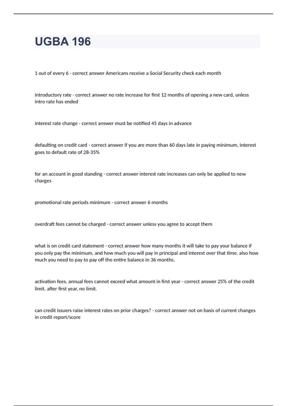 UGBA 1961 out of every 6 - correct answer Americans receive a Social Security check each month introductory rate - correct answer no rate increase for first 12 months of opening a new card, unless intro rate has ended interest rate change - correct answer must be notified 45 days in advance defaulting on credit card - correct answer if you are more than 60 days late in paying minimum, interest goes to default rate of 28-35% for an account in good standing - correct answer interest rate increases can only be applied to new charges promotional rate periods minimum - correct answer 6 months overdraft fees cannot be charged - correct answer unless you agree to accept them what is on credit card statement - correct answer how many months it will take to pay your balance if you only pay the minimum, and how much you will pay in principal and interest over that time. also how much you need to pay to pay off the entire balance in 36 months. activation fees, annual fees cannot exceed what amount in first year - correct answer 25% of the credit limit. after first year, no limit. can credit issuers raise interest rates on prior charges? - correct answer not on basis of current changes in credit report/score payments in excess of the minimum... - correct answer must first be applied to the balance with the highest interest rate how much notice do customers get before their account is closed? - correct answer 30 days max credit card fee unless one of your last six payments was late? - correct answer $25, then $35 late payment fee cannot exceed... - correct answer minimum payment can credit card companies charge inactivity fees? - correct answer no the deduction on federal return for state and local taxes? - correct answer up to 10,000 40% - correct answer percentage of children born out of wedlock 15 trillion dollars - correct answer amount of student loan debt, which exceeds credit card debt 25% - correct answer percent of the population that is obese "millionaire" - correct answer financially independent, living the life they want to lead, and able to take care of themselves without financial help from government sources longevity - correct answer retirement is not the issue, it is longevity: do not outlive your money 4.9% - correct answer percentage of households that have a net worth of at least $1 million what is wealth? - correct answer lifestyle! $400,000+ - correct answer what the top 1% of households earn, and pay 40% of income taxes