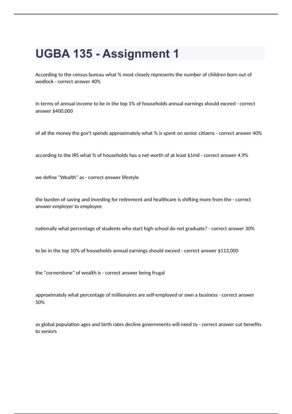 UGBA 135 - Assignment 1 According to the census bureau what % most closely represents the number of children born out of wedlock - correct answer 40% in terms of annual income to be in the top 1% of households annual earnings should exceed - correct answer $400,000 of all the money the gov't spends approximately what % is spent on senior citizens - correct answer 40% according to the IRS what % of households has a net worth of at least $1mil - correct answer 4.9% we define "Wealth" as - correct answer lifestyle the burden of saving and investing for retirement and healthcare is shifting more from the - correct answer employer to employee nationally what percentage of students who start high school do not graduate? - correct answer 30% to be in the top 10% of households annual earnings should exceed - correct answer $113,000 the "cornerstone" of wealth is - correct answer being frugal approximately what percentage of millionaires are self-employed or own a business - correct answer 50% as global population ages and birth rates decline governments will need to - correct answer cut benefits to seniors the biggest financial challenge facing future generations is - correct answer -huge federal debts to be repaid -more elderly to be supported by fewer workers -large numbers of undereducated and unemployed workers to be supported to be come a millionaire (financially independent) in today's dollars, it is required for a household to have an annual income of at least - correct answer none of the above what % of college undergrads has at least one credit card - correct answer 75% what is the average credit card balance owed by college undergrads - correct answer $3000 of all those students who use credit cards, the most common payment behavior is to - correct answer make more than the minimum payment but carry a balance which is not an interest rate - correct answer revolving when a lender is willing to loan money without requiring any collateral the loan is considered - correct answer unsecured the best way to establish credit is to - correct answer none of the above (not borrow money, pay cash for everything, write checks for everything) revolving credit is when you can - correct answer reuse your credit line over and over a credit card fee may be charged for - correct answer closing an account interest in a credit card account is normally calculated - correct answer daily the legal limit on interest applied to unpaid credit card balances is - correct answer there is no limit