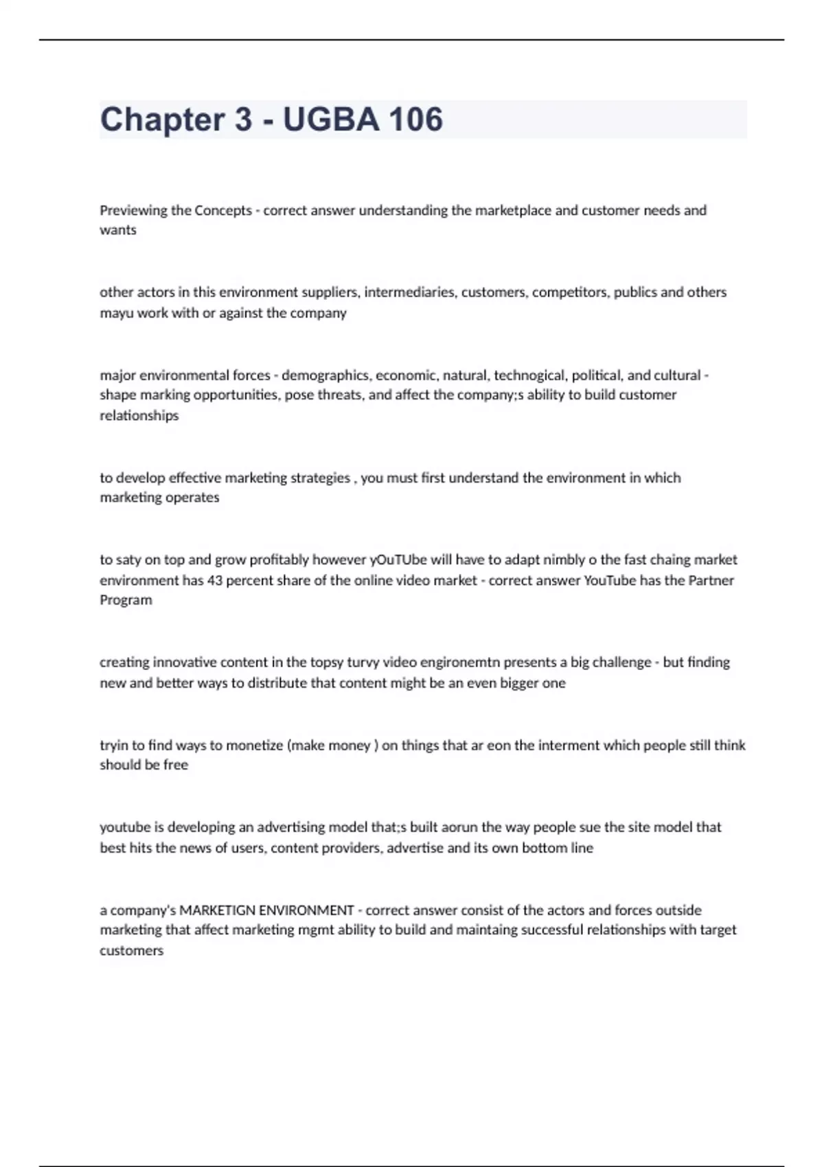 Chapter 3 - UGBA 106 Previewing the Concepts - correct answer understanding the marketplace and customer needs and wants other actors in this environment suppliers, intermediaries, customers, competitors, publics and others mayu work with or against the company major environmental forces - demographics, economic, natural, technogical, political, and cultural - shape marking opportunities, pose threats, and affect the company;s ability to build customer relationships to develop effective marketing strategies , you must first understand the environment in which marketing operates to saty on top and grow profitably however yOuTUbe will have to adapt nimbly o the fast chaing market environment has 43 percent share of the online video market - correct answer YouTube has the Partner Program creating innovative content in the topsy turvy video engironemtn presents a big challenge - but finding new and better ways to distribute that content might be an even bigger one tryin to find ways to monetize (make money ) on things that ar eon the interment which people still think should be free youtube is developing an advertising model that;s built aorun the way people sue the site model that best hits the news of users, content providers, advertise and its own bottom line a company's MARKETIGN ENVIRONMENT - correct answer consist of the actors and forces outside marketing that affect marketing mgmt ability to build and maintaing successful relationships with target customers more than any other group in the company, marketer must be environmental trend trackers and opportunity seekers 1) they have disciplined methods - marketing research and marketing intelligence - for collecting information about the marketing environment 2) spend more time in customer and competitor environments . by carefully studying the environment marketers can adapt their strategies to meet new marketplace challenges and opporutninites - correct answer ... the environment consist of microenvironment and macro environment - correct answer ... MICROENVIRONMENT - correct answer consists of the actors close to the company that affects it ability to serve its customers - the 1)company 2) suppliers 3)marketing intermediaries, 4)customer markets, 5)competitors 6) publics MACRO ENVIRONMENT - correct answer consists of the larger societal forces that affect the microevironment - demographic, economic, natural, technological, political, and cultural forces MICROENVONMENT -- - correct answer marketing success requires buidlign relationships with other company departments, suppliers, marketing intermediaries, competitors, various publics, and customs, which combine to make up the company's value delivery network THE COMPANY - correct answer in designing marketing plans, markeign mgmt takes other company groups into account - groups such as top mgmt finance, R&D, purchasing, operations, and accouting all of these interrelated groups form the INTERNAL ENVIRONMENT