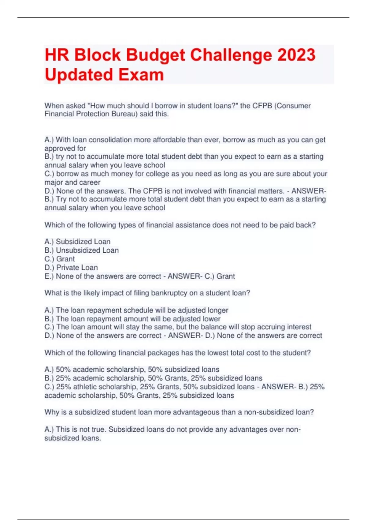 HR Block Budget Challenge 2023 Updated Exam When asked "How much should I borrow in student loans?" the CFPB (Consumer Financial Protection Bureau) said this. A.) With loan consolidation more affordable than ever, borrow as much as you can get approved for B.) try not to accumulate more total student debt than you expect to earn as a starting annual salary when you leave school C.) borrow as much money for college as you need as long as you are sure about your major and career D.) None of the answers. The CFPB is not involved with financial matters. - ANSWERB.) Try not to accumulate more total student debt than you expect to earn as a starting annual salary when you leave school Which of the following types of financial assistance does not need to be paid back? A.) Subsidized Loan B.) Unsubsidized Loan C.) Grant D.) Private Loan E.) None of the answers are correct - ANSWER- C.) Grant What is the likely impact of filing bankruptcy on a student loan? A.) The loan repayment schedule will be adjusted longer B.) The loan repayment amount will be adjusted lower C.) The loan amount will stay the same, but the balance will stop accruing interest D.) None of the answers are correct - ANSWER- D.) None of the answers are correct Which of the following financial packages has the lowest total cost to the student? A.) 50% academic scholarship, 50% subsidized loans B.) 25% academic scholarship, 50% Grants, 25% subsidized loans C.) 25% athletic scholarship, 25% Grants, 50% subsidized loans - ANSWER- B.) 25% academic scholarship, 50% Grants, 25% subsidized loans Why is a subsidized student loan more advantageous than a non-subsidized loan? A.) This is not true. Subsidized loans do not provide any advantages over nonsubsidized loans. B.) Subsidized loans usually have lower interest rates C.) Subsidized loans usually have a period of time after graduation where payments are not required. D.) Subsidized loans do not have to be paid back E.) Subsidized loans usually have lower interest rates and a period of time after graduation where payments are not required - ANSWER- E.) Subsidized loans usually have lower interest rates and a period of time after graduation where payments are not required Which event will have the greatest impact (positive or negative) on one's net worth after one month? A.) Buy a new car at market value for $15,000. Car depreciates 20% upon transfer of ownership. B.) Buy a used car at market value for $15,000 C.) Lease a $15,000 car on a 3 year lease. The monthly payment is $199 and all lease payments are required in the lease. D.) None of these events will impact the net worth of an individual - ANSWER- C.) Lease a $15,000 car on a 3 year lease. The monthly payment is $199 and all lease payments are required in the lease. If a home mortgage has a term of 15 years and a payment of $1,000, what is the loan amount? (assume that there are no interest-free mortgages) A.) $180,000 B.) Less than $180,000 C.) $200,000 D.) $360,000 - ANSWER- B.) Less than $180,000 If a home buyer puts 20% down on a $200,000 house and uses a mortgage to borrow the rest, how much will the mortgage be (excluding any closing costs)? A.) $160,000 B.) $200,000 C.) $180,000 D.) $240,000 - ANSWER- A.) $160,000 Which of the following will increase your net worth the most? A.) Purchase of house valued at $150,000 with $25,000 down and a mortgage of $125,000 B.) Purchase a used car valued at $7,000 with an Auto Loan for $7,000 C.) Sell a bike valued at $75 for $75 cash D.) All of these increase net worth E.) None of these increase net worth - ANSWER- E.) None of these increase net worth Sub-prime lending rates are 1) __________ than prime lending rates and are for people with 2)__________ credit. A.) 1) lower 2) good, B.) 2) higher 2) good C.) 1) lower 2) poor D.) 1) higher 2) poor - ANSWER- D.) 1) higher 2) poor Which loan type isn't secured with collateral? A.) Mortgages (home loans) B.) Subsidized student loans C.) Auto loans D.) Small business loans E.) All of the answers are correct F.) None of the answers are correct - ANSWER- B.) Subsidized student loans Which are tax deductible? A.) Community service hours B.) Student loan payments C.) Medical Bills totaling $200 D.) 401k gains E.) None of the answers are correct F.) All of the answers are correct - ANSWER- E.) None of the answers are correc