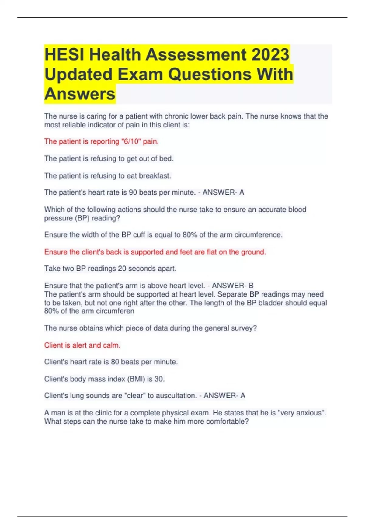 HESI Health Assessment 2023 Updated Exam Questions With Answers The nurse is caring for a patient with chronic lower back pain. The nurse knows that the most reliable indicator of pain in this client is: The patient is reporting "6/10" pain. The patient is refusing to get out of bed. The patient is refusing to eat breakfast. The patient's heart rate is 90 beats per minute. - ANSWER- A Which of the following actions should the nurse take to ensure an accurate blood pressure (BP) reading? Ensure the width of the BP cuff is equal to 80% of the arm circumference. Ensure the client's back is supported and feet are flat on the ground. Take two BP readings 20 seconds apart. Ensure that the patient's arm is above heart level. - ANSWER- B The patient's arm should be supported at heart level. Separate BP readings may need to be taken, but not one right after the other. The length of the BP bladder should equal 80% of the arm circumferen The nurse obtains which piece of data during the general survey? Client is alert and calm. Client's heart rate is 80 beats per minute. Client's body mass index (BMI) is 30. Client's lung sounds are "clear" to auscultation. - ANSWER- A A man is at the clinic for a complete physical exam. He states that he is "very anxious". What steps can the nurse take to make him more comfortable? Appear confident and unhurried during the exam. Measure vital signs at the end to allow the patient sufficient time to relax. Let him leave his clothes on during the examination. Obtain another nurse to examine the patient. - ANSWER- A A father brings his 13 month-old child in for "fever" and he reports that the child has been "pulling on his left ear". Upon entering the exam room, the child is asleep in the father's arms. The nurse should perform which assessment first? Use the otoscope to look inside the ear. Use a penlight to check the eyes and nose. Auscultate the lungs, heart, and abdomen. Assess gross motor skills using the Denver II screening tool. - ANSWER- C An 18 year-old presents to the emergency department with "headache." Which of these assessment findings alerts the nurse to recent opioid use? Pupillary constriction Hallucinations. Fever. Tachypnea. - ANSWER- A- constricted pupils are a sign of recent opioid use, the rest are withdrawals While collecting the pulse on a 26 year-old client, the nurse notes that the heart rate seems to speed up and then slowdown in accordance with respirations. The pulse is counted at 80 beats per minute. What should the nurse do next? Obtain orthostatic vital signs. Notify the physician. Document "sinus arrhythmia." Use a doppler to confirm the finding. - ANSWER- C An elderly client with pneumonia is being treated in the intensive care unit (ICU). He is acutely agitated, restless, and disoriented. The nurse documents his level of consciousness as: Manic. Demented. Drowsy. Delirious. - ANSWER- D The nurse is assessing a newborn infant. How should the nurse measure the heart rate (HR)? Palpate the radial pulse for 15 seconds and multiply by four. Palpate the brachial pulse for 30 seconds and multiply by two. Auscultate the apical site for 60 seconds. Apply a pulse oximeter to obtain both the HR and SpO2. - ANSWER- C A 28 year-old is brought to the emergency department. He is disoriented and hallucinating, and vital signs are elevated. The nurse suspects that the patient is experiencing withdrawal symptoms from which substance? Alcohol. Cocaine. Cannabis. Opiates. - ANSWER- A- hallucinations and delirium are commonly seen w alcohol withdrawal When evaluating the temperature of older adults, the nurse should remember which aspect about an older adult's body temperature? Fever is a reliable sign of infection in older adults. The older adult's body temperature varies widely because of the thinner subcutaneous layer. There are no differences in temperature between a young and old adult. Older adults body temperature runs lower than that of an adult. - ANSWER- D Which error may result in a falsely low blood pressure (BP) reading? The patient has a full bladder. The arm is held above the level of the heart. The cuff size is too small for the client. The BP cuff is wrapped loosely around the arm. - ANSWER- B- at heart level During a general survey of a post-operative patient, the nurse notes that the patient's eyes are closed but they temporarily open with loud verbal stimulus and a gentle shake to the shoulder. The nurse documents his level of consciousness as: Alert. Somnolent. Stuporous. Obtunded. - ANSWER-