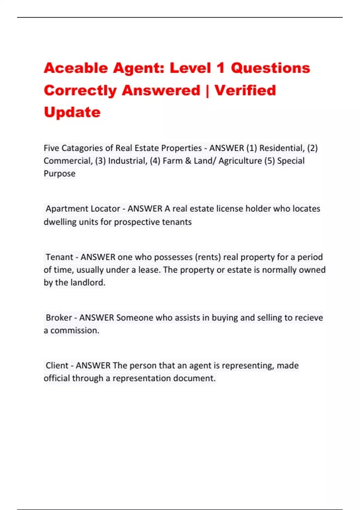 Aceable Agent: Level 1 Questions Correctly Answered | Verified Update Five Catagories of Real Estate Properties - ANSWER (1) Residential, (2) Commercial, (3) Industrial, (4) Farm & Land/ Agriculture (5) Special Purpose Apartment Locator - ANSWER A real estate license holder who locates dwelling units for prospective tenants Tenant - ANSWER one who possesses (rents) real property for a period of time, usually under a lease. The property or estate is normally owned by the landlord. Broker - ANSWER Someone who assists in buying and selling to recieve a commission. Client - ANSWER The person that an agent is representing, made official through a representation document. Sales Agent Apprentice Education (SAE) - ANSWER an educational requirement for courses in the first two years of being licensed as a real estate agent. Consumer - ANSWER A person or company that buys or leases any product or service. Education Standards Advisory Committee (ESAC) - ANSWER To review and revise curriculum standards, course content and instructor certification requirements for both qualifying and continuing education courses. Committee Members - ANSWER 12 members appointed by the commission. *Seven members who are license holders. *Four education members who are real estate instructors or owners of real estate schools. *One member who represents the public. *Serve staggered two- year terms. Real Estate Industry Services - ANSWER Brokerage, Appraisal, Property Managment, Development, Counceling, Financial and Education.