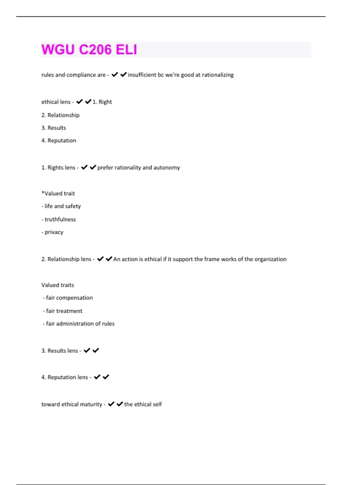rules and compliance are - insufficient bc we're good at rationalizing ethical lens - 1. Right 2. Relationship 3. Results 4. Reputation 1. Rights lens - prefer rationality and autonomy *Valued trait - life and safety - truthfulness - privacy 2. Relationship lens - An action is ethical if it support the frame works of the organization Valued traits - fair compensation - fair treatment - fair administration of rules 3. Results lens - 4. Reputation lens - toward ethical maturity - the ethical selfself knowledge and self control what are my core values and commitments? "good egg" what is my shadow side and here can i be tempted? "bad egg" the big question - is everyone who is thoughtful knows what is right and what is ethical, what are there so many different answers? bc it depends ethical lens inventory test - intentionality ELI - look at chart rationality - tend to use head and logic methodical about processes things that are universalizable (universal rules, standards, processes) sensibility - about the heart, intuition not about logic, its about how you feel about the outcomes, show mercy and take into account context autonomy - individs and their rights make decision for yourself equality - community not what you have a right to, but your responsibility to those around you connections to others relationship lens - high rational and high equalityresults lens - create win/win, maximize the good for individuals (not the relationship between them) autonomy and sensibility the worst of the worst overvalue outcomes reputation lens - high equality and high sensibility relationships between people rationality ELI - if you pay attention to reason critical thinking sensibility ELI - if you pay attention to you heart intuition and emotions to determine what behavior is ethical