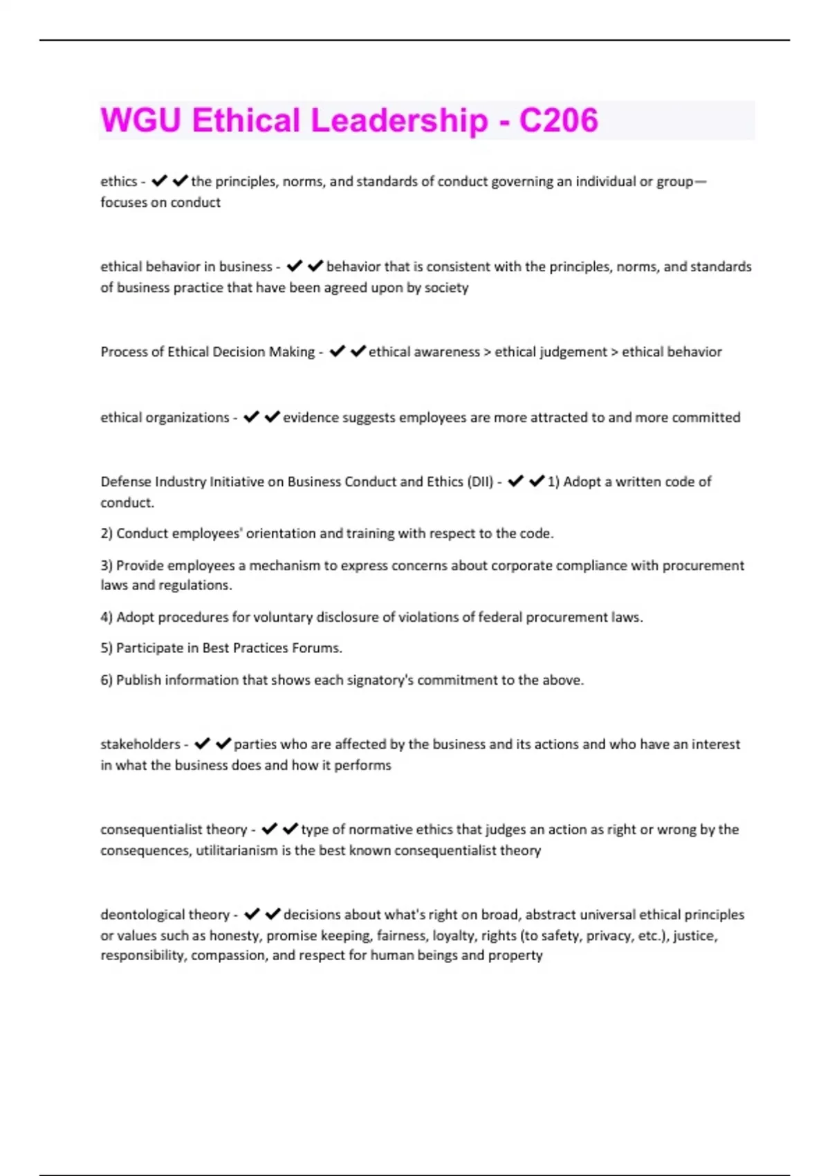 WGU Ethical Leadership - C206 Questions With Complete Solutions Graded A+