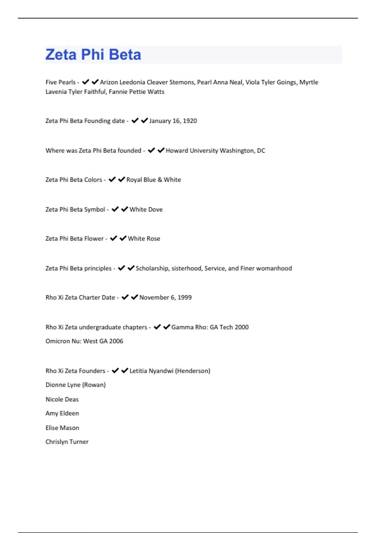 Five Pearls - Arizon Leedonia Cleaver Stemons, Pearl Anna Neal, Viola Tyler Goings, Myrtle Lavenia Tyler Faithful, Fannie Pettie Watts Zeta Phi Beta Founding date - January 16, 1920 Where was Zeta Phi Beta founded - Howard University Washington, DC Zeta Phi Beta Colors - Royal Blue & White Zeta Phi Beta Symbol - White Dove Zeta Phi Beta Flower - White Rose Zeta Phi Beta principles -Scholarship, sisterhood, Service, and Finer womanhood Rho Xi Zeta Charter Date -November 6, 1999 Rho Xi Zeta undergraduate chapters - Gamma Rho: GA Tech 2000 Omicron Nu: West GA 2006 Rho Xi Zeta Founders - Letitia Nyandwi (Henderson) Dionne Lyne (Rowan) Nicole Deas Amy Eldeen Elise Mason Chrislyn TurnerRho Xi Zeta chapter of the year - 2009, 2014, & 2015 Rho Xi Zeta region - Southeast