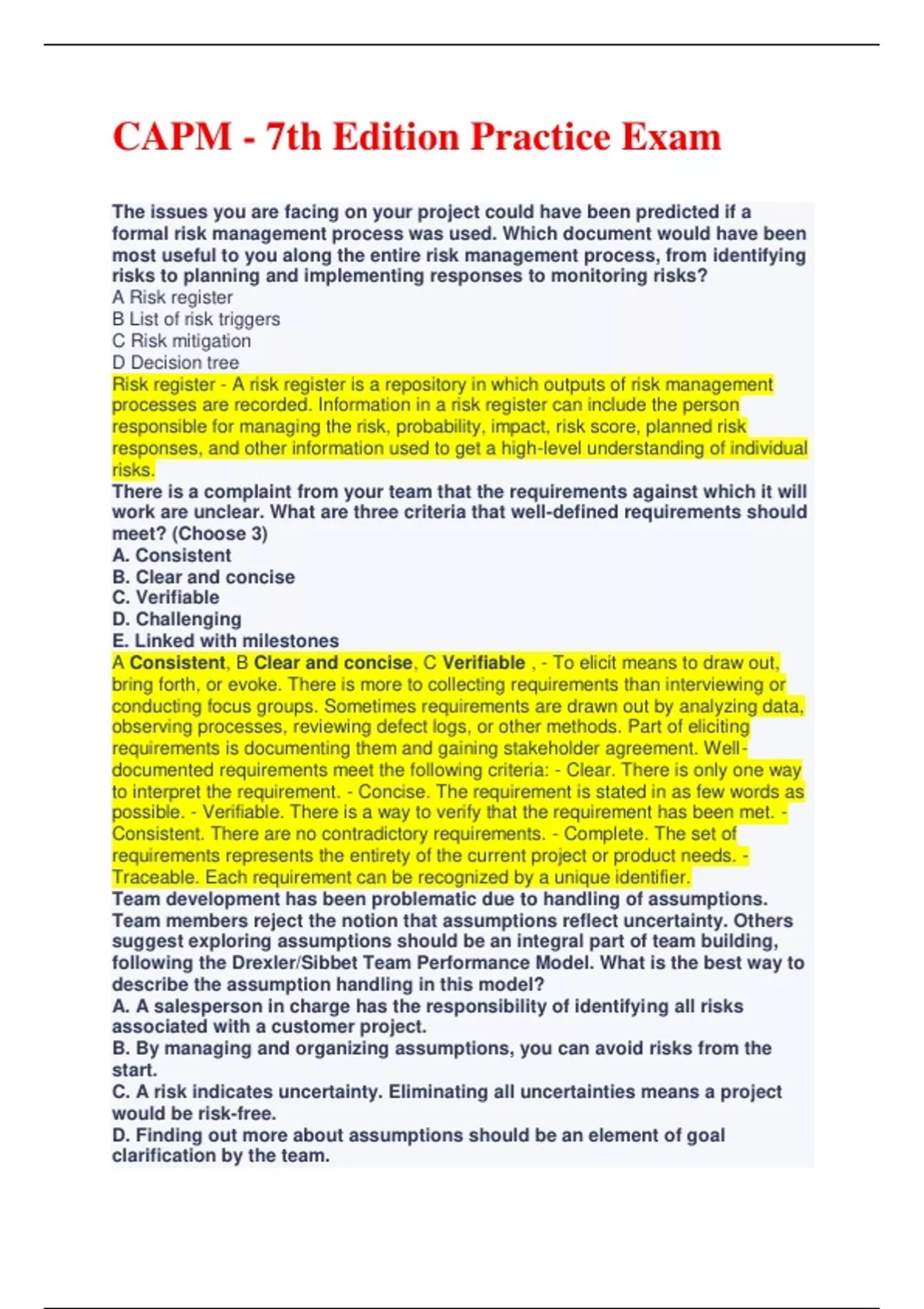 Risk register - A risk register is a repository in which outputs of risk management processes are recorded. Information in a risk register can include the person responsible for managing the risk, probability, impact, risk score, planned risk responses, and other information used to get a high-level understanding of individual risks. There is a complaint from your team that the requirements against which it will work are unclear. What are three criteria that well-defined requirements should meet? (Choose 3) A. Consistent B. Clear and concise C. Verifiable D. Challenging E. Linked with milestones A Consistent, B Clear and concise, C Verifiable , - To elicit means to draw out, bring forth, or evoke. There is more to collecting requirements than interviewing or conducting focus groups. Sometimes requirements are drawn out by analyzing data, observing processes, reviewing defect logs, or other methods. Part of eliciting requirements is documenting them and gaining stakeholder agreement. Welldocumented requirements meet the following criteria: - Clear. There is only one way to interpret the requirement. - Concise. The requirement is stated in as few words as possible. - Verifiable. There is a way to verify that the requirement has been met. - Consistent. There are no contradictory requirements. - Complete. The set of requirements represents the entirety of the current project or product needs. - Traceable. Each requirement can be recognized by a unique identifier.
