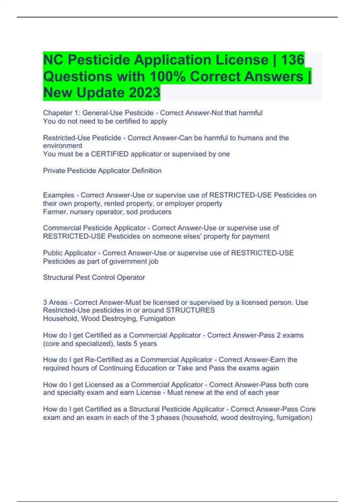 NC Pesticide Application License | 136 Questions with 100% Correct Answers | New Update 2023